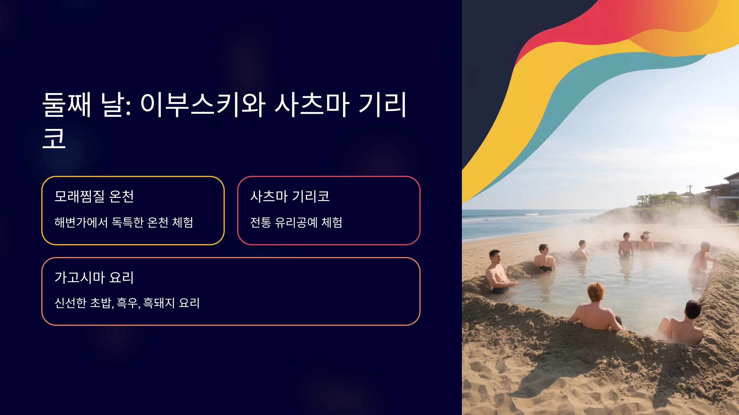 둘째 날은 이부스키 지역으로 이동해 특별한 온천 체험을 즐겨보세요. 이부스키는 모래찜질 온천으로 유명한데, 뜨거운 모래 속에 몸을 묻고 피로를 푸는 독특한 경험을 할 수 있어요. 특히, 해변가에서 하는 모래찜질은 주변 풍경과 어우러져 더욱 특별해요.