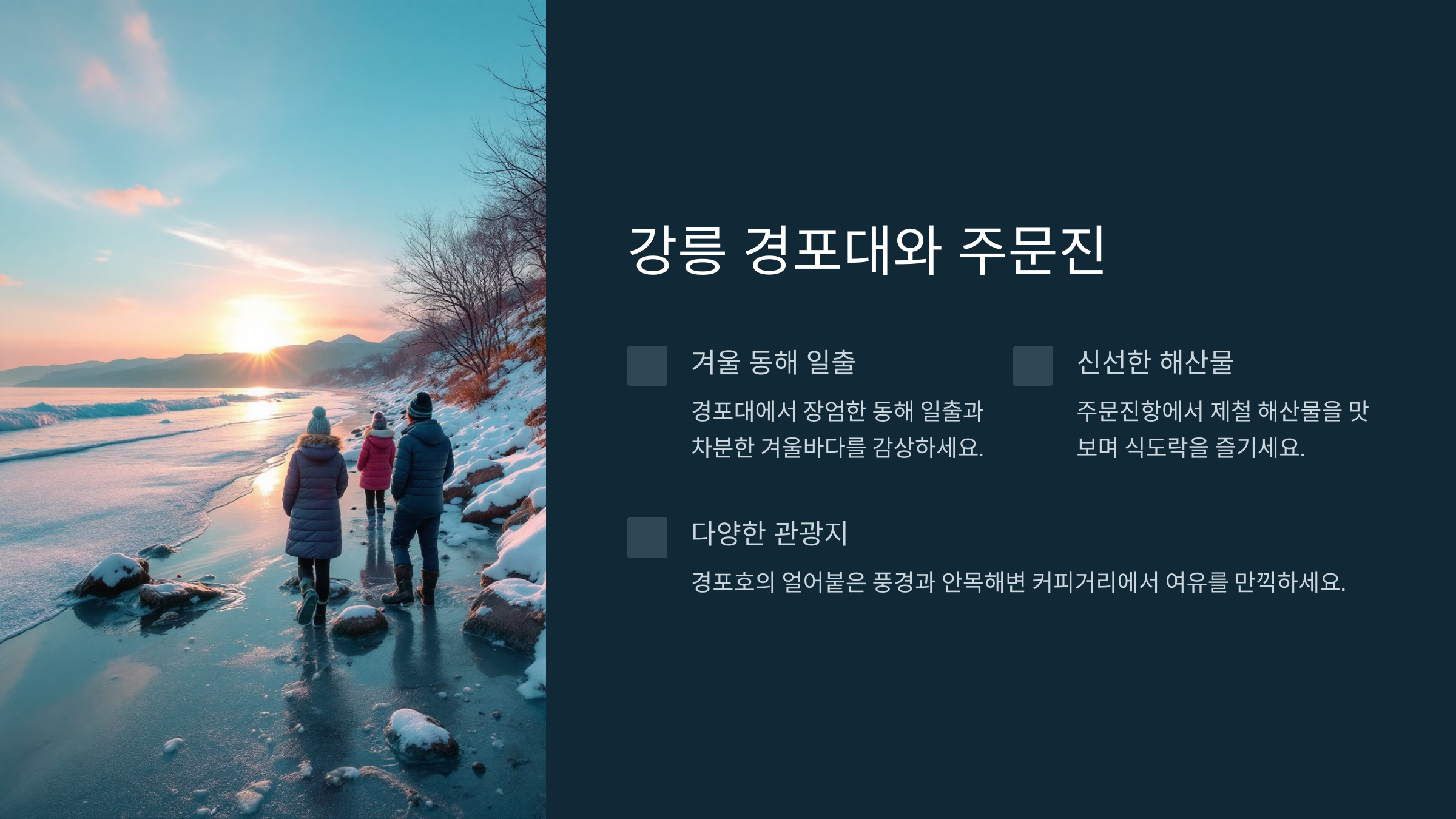 추가로, 경포대 근처의 경포호는 겨울철에 얼어붙어 독특한 겨울 풍경을 선사합니다. 얼음 위로 떨어지는 햇빛이 반짝이는 모습은 강릉에서만 느낄 수 있는 매력 중 하나입니다. 이처럼 강릉은 겨울철 고요한 바다와 더불어 맛있는 음식, 아름다운 풍경까지 모두 갖춘 완벽한 겨울바다 여행지입니다.