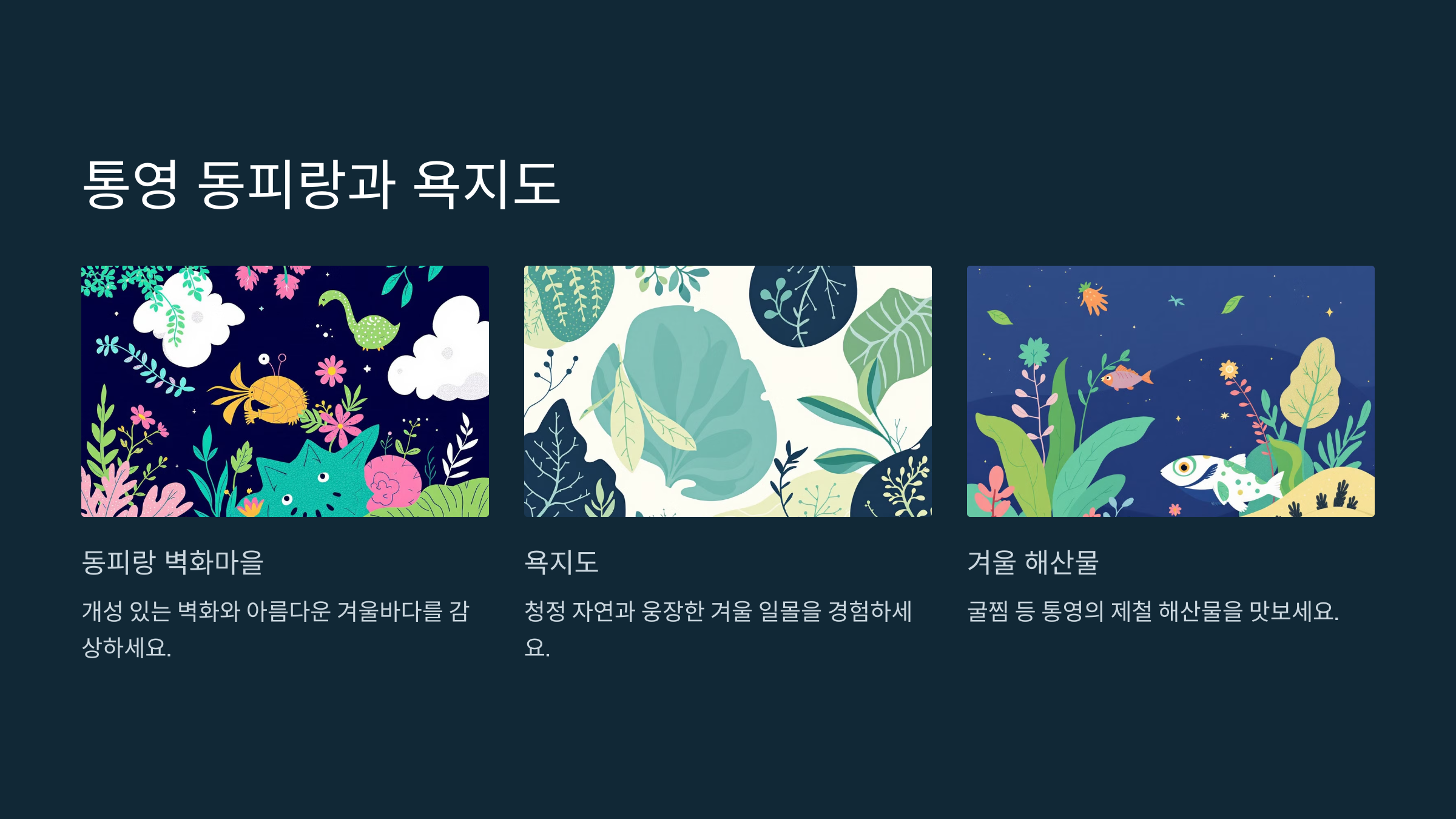 통영은 신선한 해산물 요리로도 유명합니다. 굴찜, 해물탕 등 겨울철에 제철을 맞은 해산물 요리는 입맛을 사로잡기에 충분합니다. 동피랑에서 사진을 찍고, 욕지도에서 자연을 즐기며, 따뜻한 음식을 맛보는 통영 여행은 겨울바다의 특별함을 온전히 느낄 수 있는 여행 코스입니다.