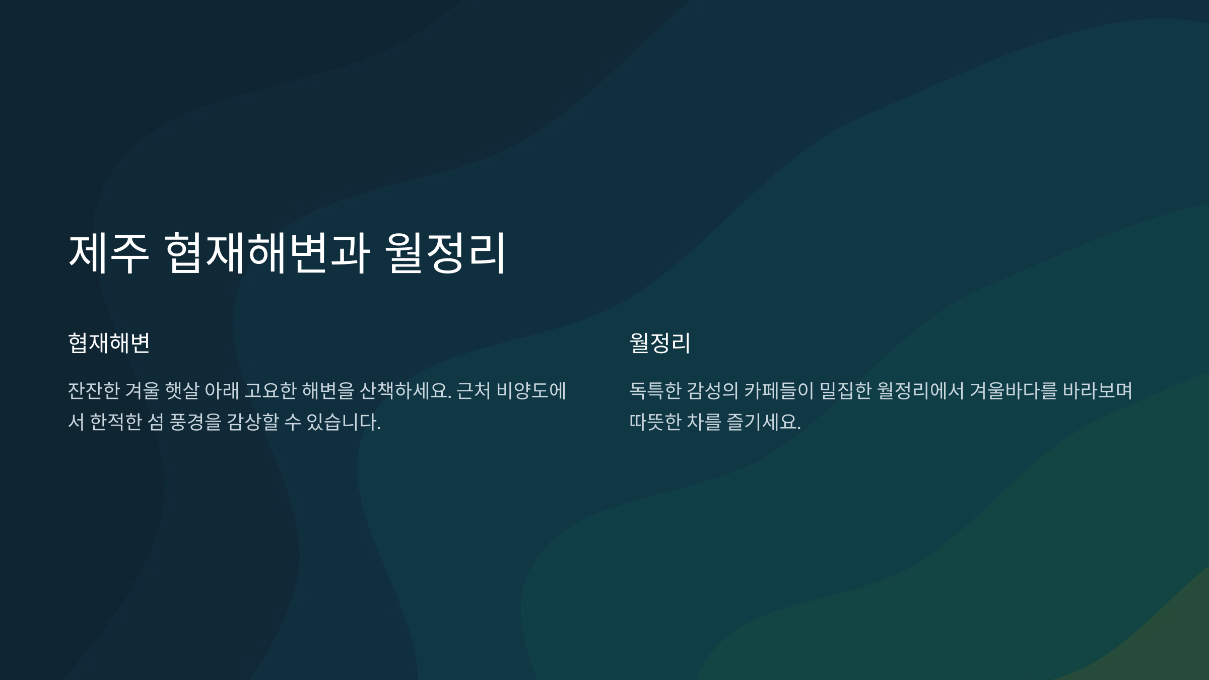 제주의 겨울바다는 온화한 날씨 덕분에 여행하기에 부담이 없습니다. 협재와 월정리는 접근성이 좋아 렌터카를 이용하지 않아도 비교적 쉽게 방문할 수 있어 여행 초보자들에게도 추천합니다. 겨울바다의 고요함 속에서 제주 특유의 정취를 느껴보세요.