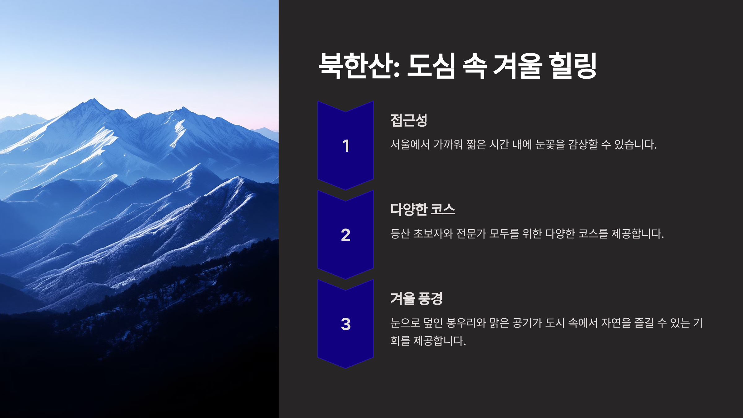 백운대 코스는 겨울철 아름다운 설경을 즐기기에 가장 추천되는 경로입니다.
