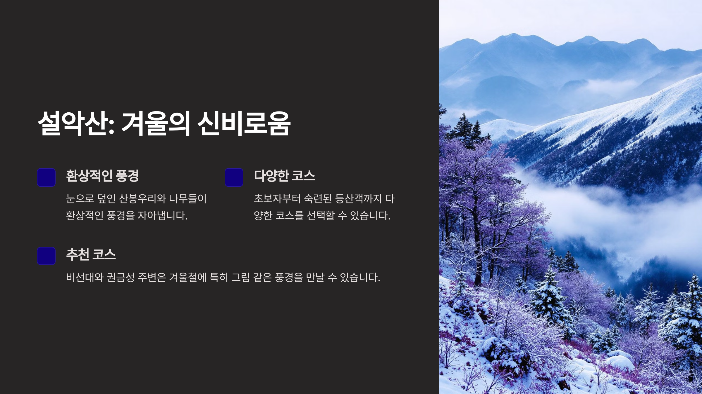 설악산은 겨울철 대표적인 눈꽃 명소로, 눈으로 덮인 산봉우리와 나무들이 환상적인 풍경을 자아냅니다.