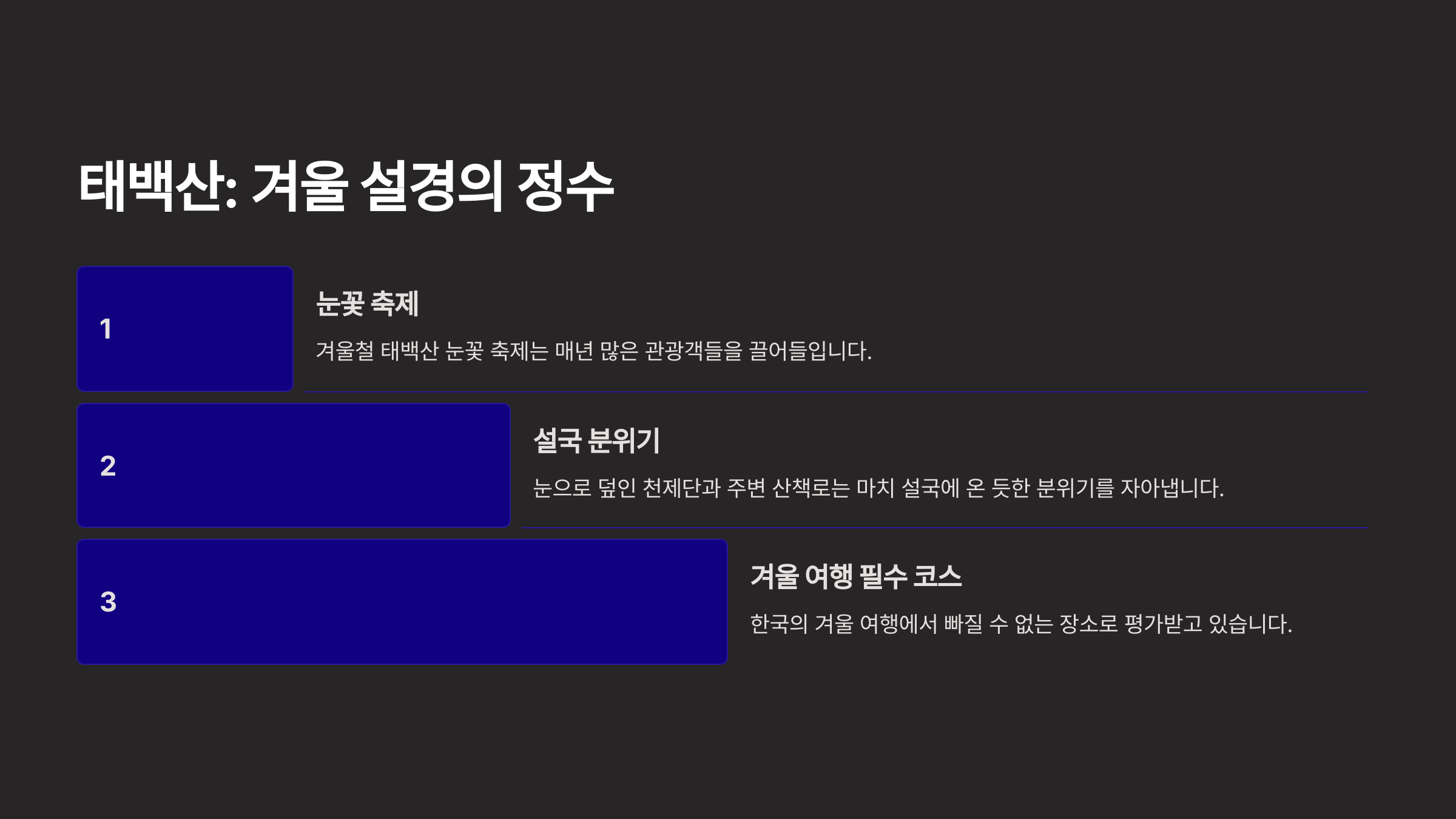 태백산은 낮은 온도와 깨끗한 공기로 겨울의 신비로운 자연을 느끼기에 이상적입니다.