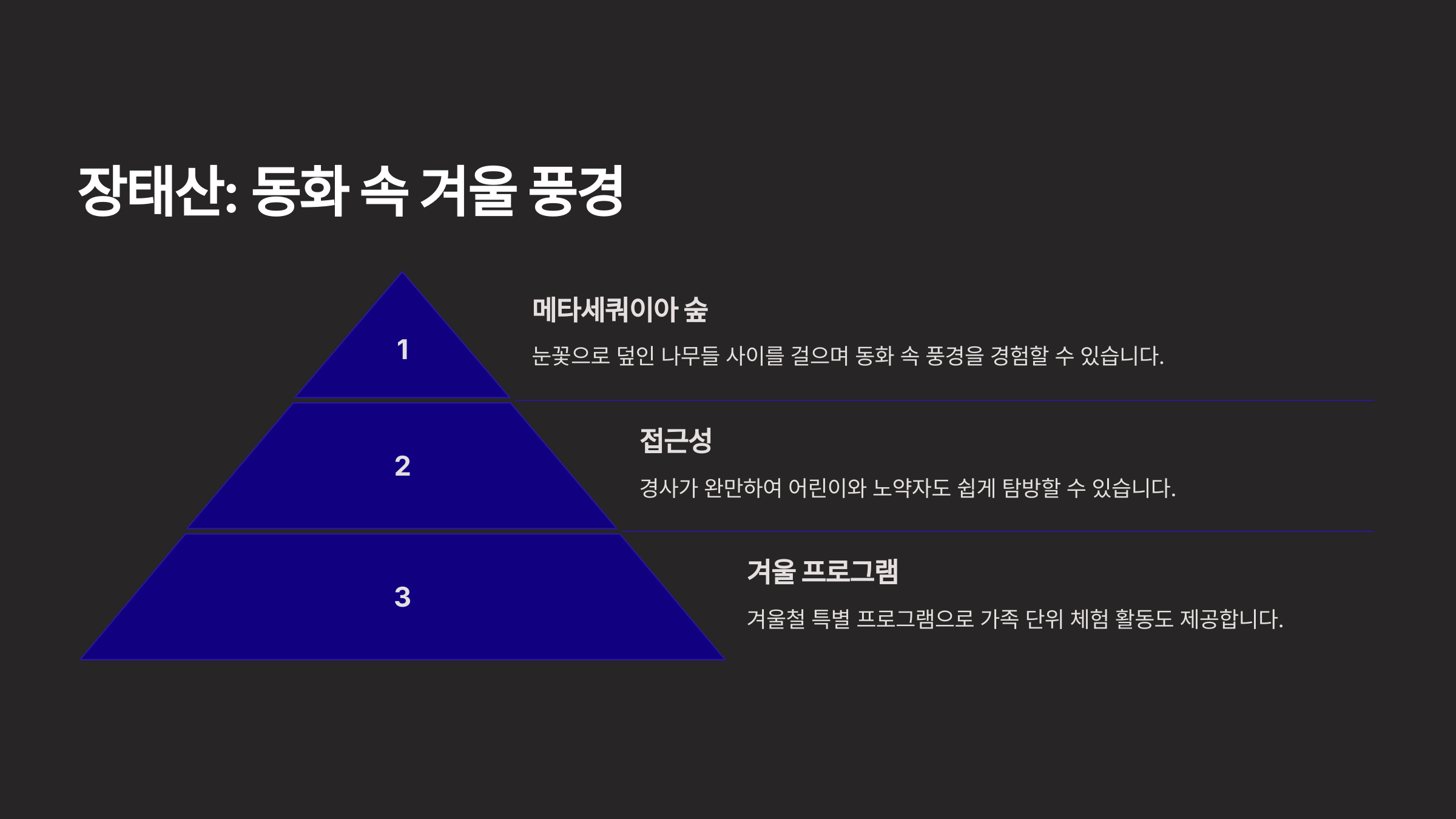 장태산은 대전 근처에 위치한 독특한 겨울 명소로, 메타세쿼이아 숲이 유명합니다.