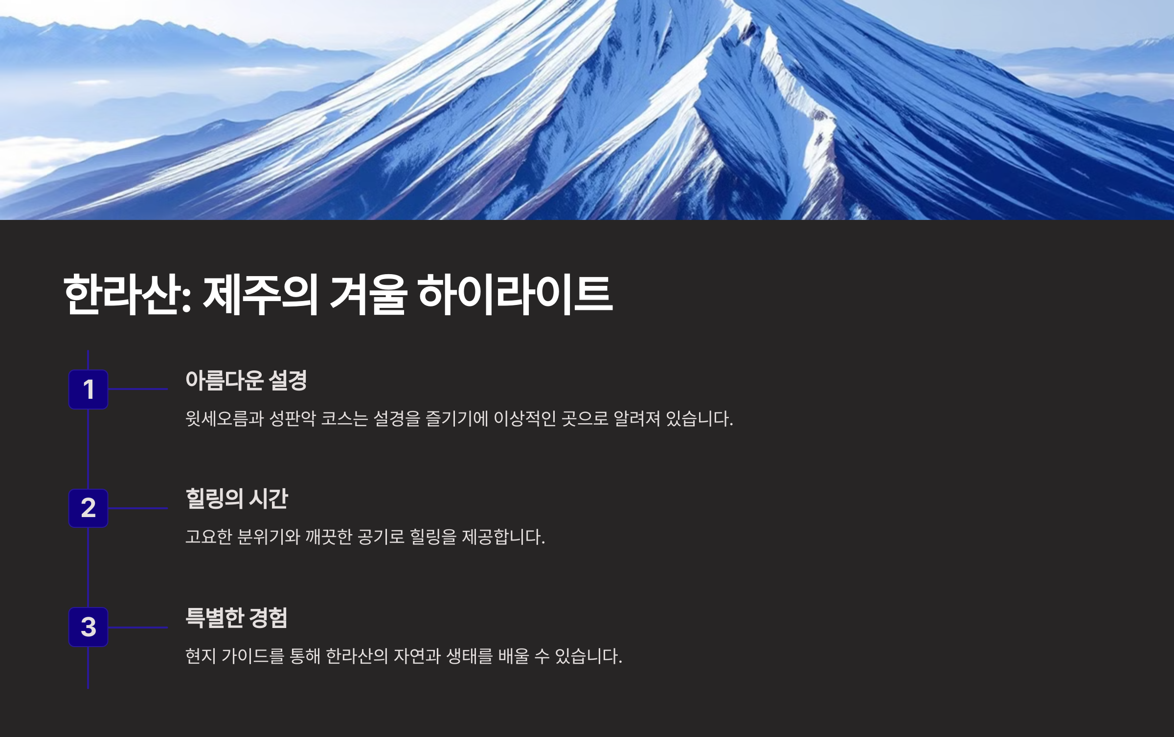 제주도의 한라산은 한국에서 가장 높은 산으로, 겨울철 눈꽃이 아름답기로 유명합니다.