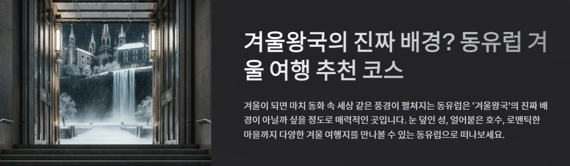 겨울이 되면 마치 동화 속 세상 같은 풍경이 펼쳐지는 동유럽은 '겨울왕국'의 진짜 배경이 아닐까 싶을 정도로 매력적인 곳입니다. 눈 덮인 성, 얼어붙은 호수, 로맨틱한 마을까지 다양한 겨울 여행지를 만나볼 수 있는 동유럽으로 떠나보세요. 이 글에서는 동유럽 겨울 여행의 필수 코스와 매력을 소개합니다.