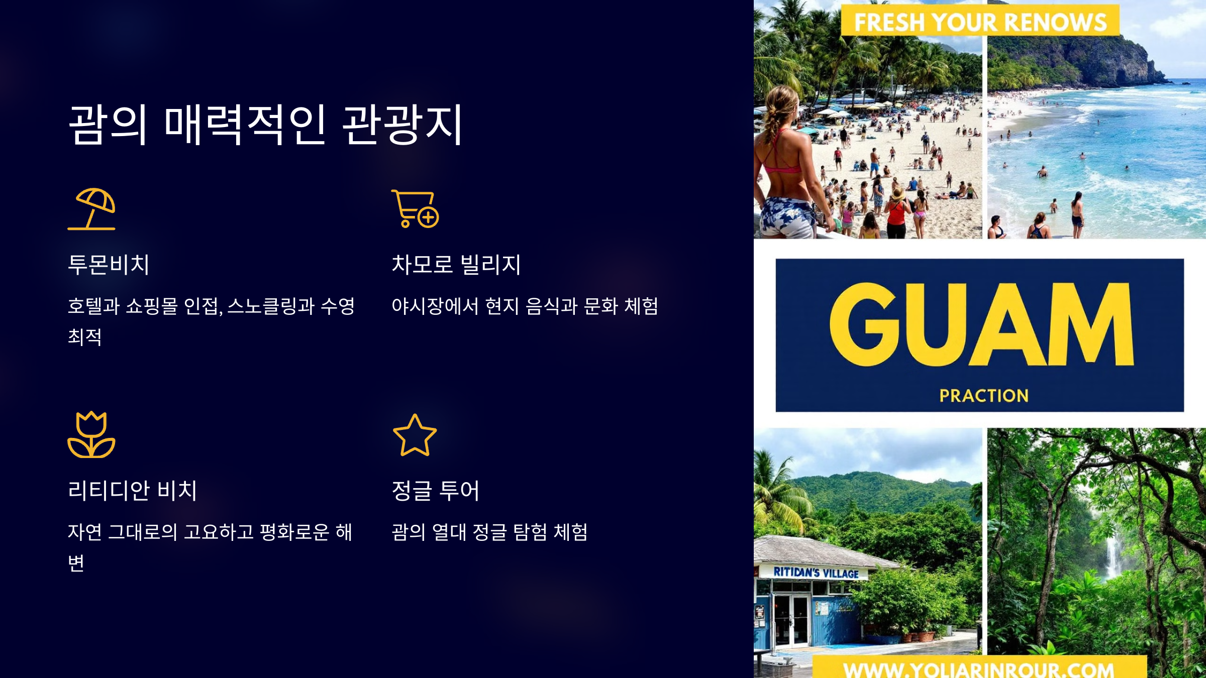 괌은 쇼핑, 해양 스포츠, 힐링, 역사탐방 등 다양한 테마의 여행이 가능하며, 여행 일정에 맞추어 여러 경험을 즐길 수 있는 곳입니다. 이 글에서는 괌 여행을 준비할 때 꼭 알아야 할 정보와 팁, 그리고 주요 명소와 액티비티를 소개하겠습니다. 괌 여행을 계획 중이시라면, 이 가이드를 끝까지 읽어보세요. 모든 정보가 한곳에 정리되어 있습니다.