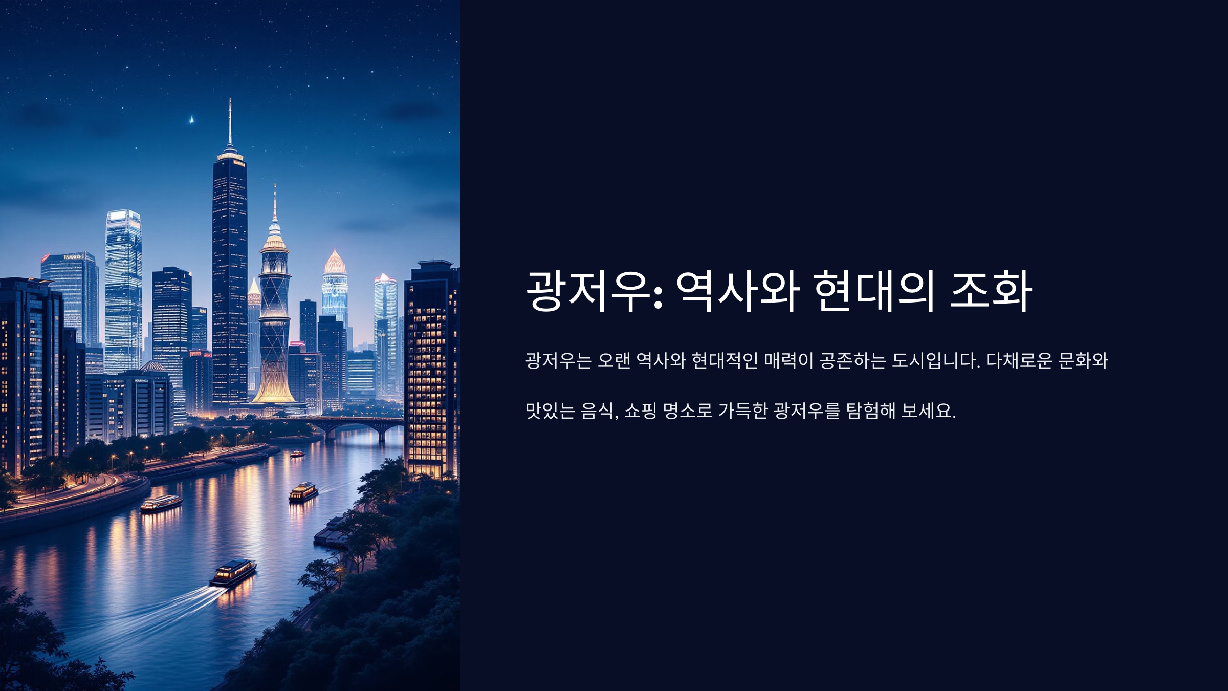 광저우(广州)는 중국 광둥성의 중심 도시이자 중국 3대 도시 중 하나로, 국제적인 상업과 문화의 중심지예요. 수천 년의 역사를 자랑하며, 동서양이 교류하는 무역 도시로서 발전해 왔죠.