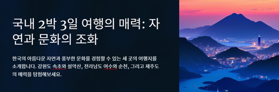 국내 여행을 계획하면서 가장 중요한 것은 일정에 맞는 장소를 고르는 것입니다. 2박 3일이라는 시간은 짧지만 알차게 즐길 수 있는 기회입니다. 아래 추천하는 여행지는 각각 고유의 매력과 다양한 체험 거리를 제공하여 누구나 만족할 수 있는 여행을 만들어 줍니다. 자연과 도시, 문화와 휴식을 동시에 즐길 수 있는 곳들을 중심으로 소개하겠습니다.