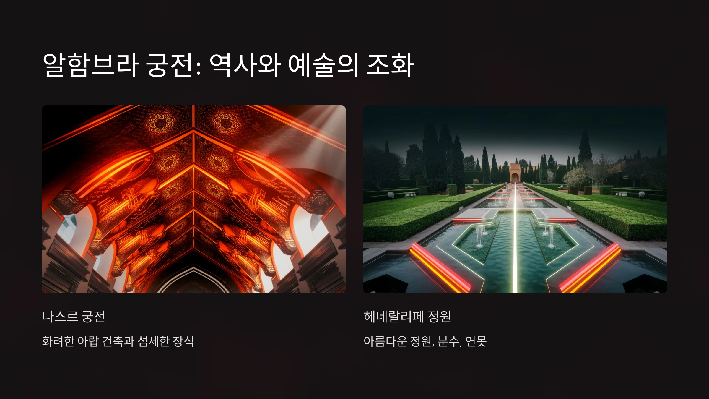 그라나다의 상징인 알함브라 궁전은 꼭 방문해야 하는 명소예요. 13세기 무슬림 왕조가 지은 이곳은 아름다운 건축물과 정원이 조화를 이루는 대표적인 유적지로 손꼽혀요. 특히 ‘사자의 뜰’이나 ‘나스르 왕궁’은 웅장한 장식과 섬세한 디자인으로 방문객을 사로잡아요.