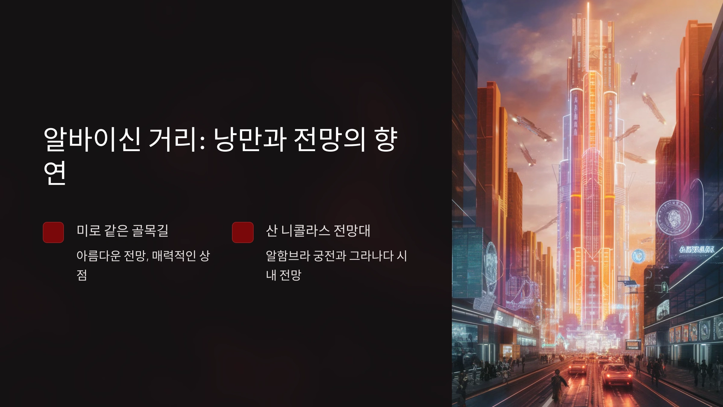 이곳에서는 미로 같은 골목길을 따라 걷다 보면 자연스럽게 흥미로운 장소와 마주하게 돼요. 산니콜라스 전망대도 이 지역에 위치하고 있어, 산책과 함께 알함브라를 바라보는 멋진 풍경을 감상할 수 있어요.
