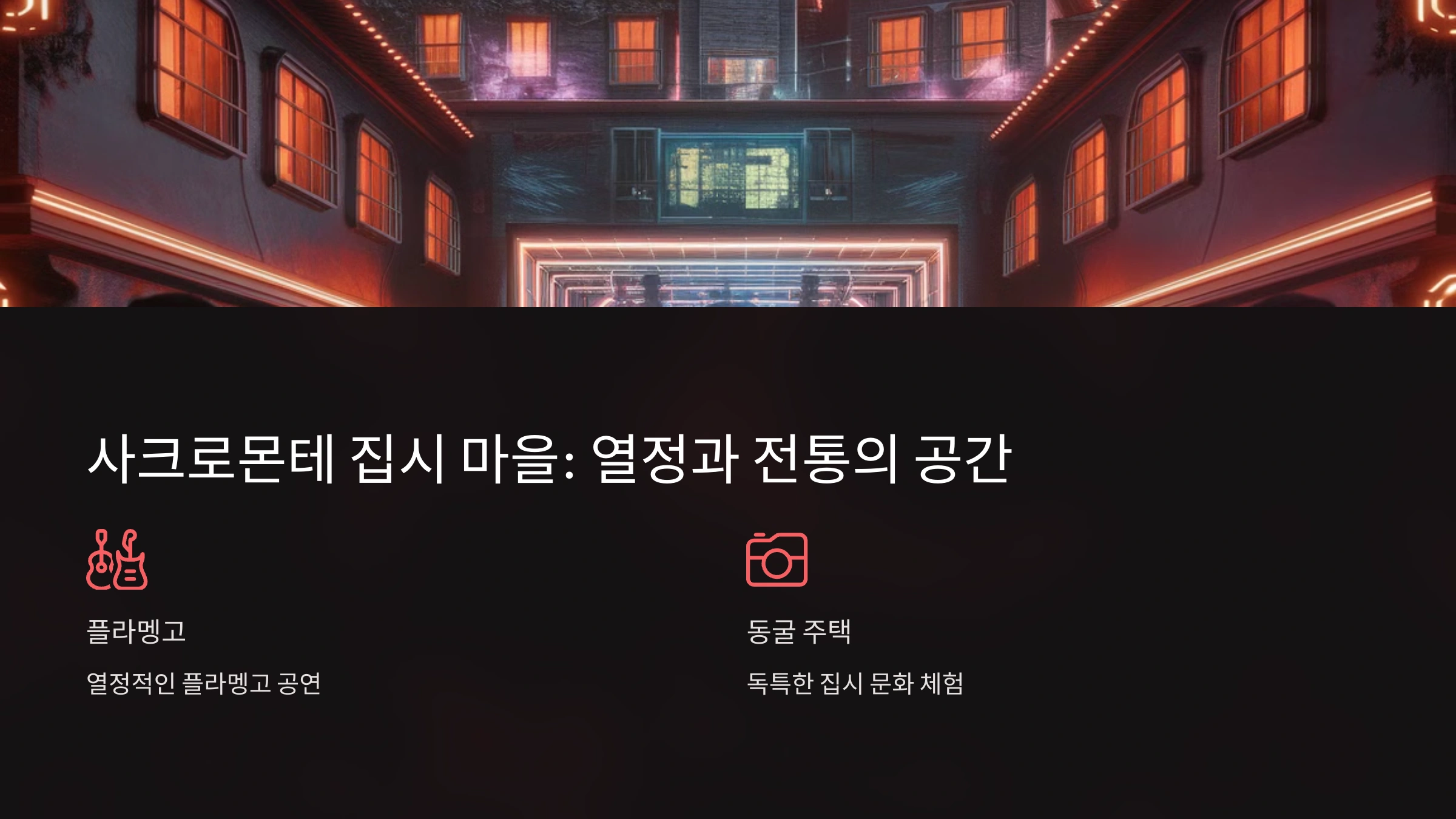 사크로몬테는 그라나다의 전통적인 집시 마을로, 독특한 동굴 주택으로 유명해요. 이 지역은 플라멩코 공연의 발상지 중 하나로, 스페인의 전통 문화를 경험할 수 있는 곳이에요. 동굴 내부에서 펼쳐지는 열정적인 플라멩코 공연은 꼭 관람해 보세요.