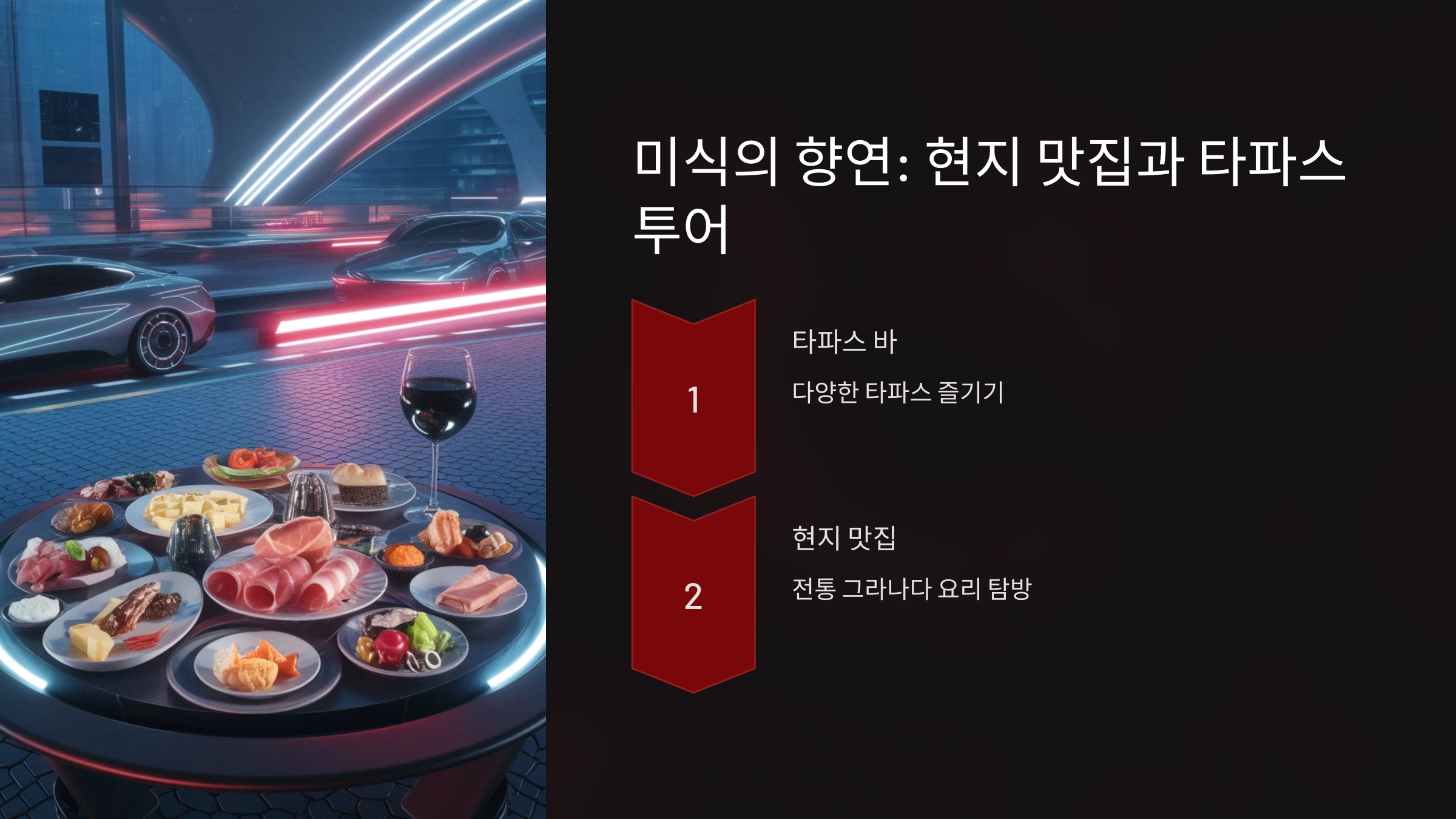 대표적인 타파스 메뉴로는 하몽(스페인식 생햄), 파타타스 브라바스(감자튀김), 그리고 알본디가스(미트볼)가 있어요. 각 바마다 제공하는 메뉴가 다르니 여러 군데를 방문하며 비교해보는 것도 재미있어요.