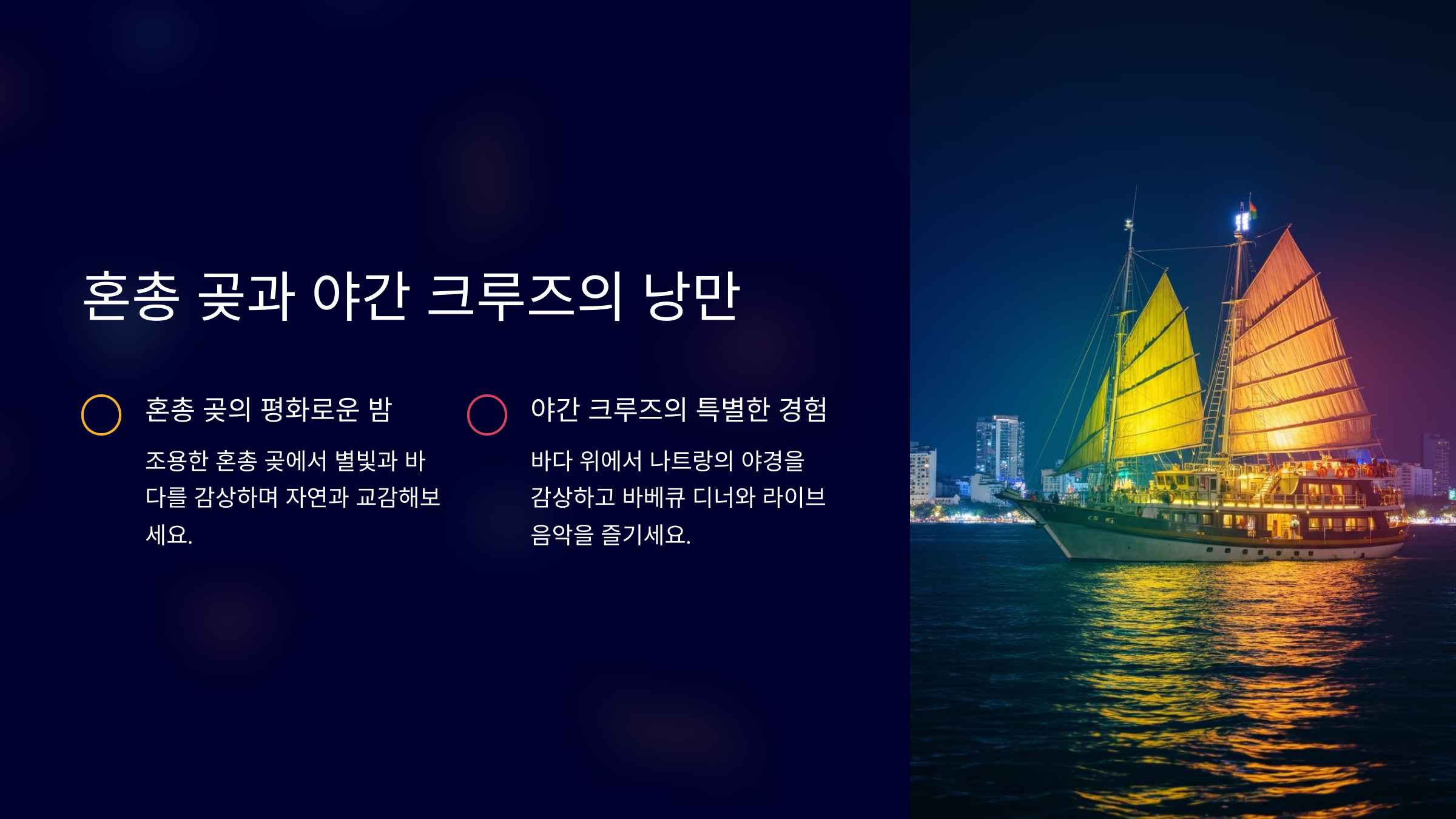 야간 크루즈 투어는 나트랑의 밤을 더 특별하게 만들어 줄 것입니다.