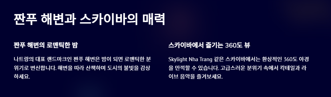 밤에는 낮과는 또 다른 매력의 나트랑을 발견할 수 있어 여행을 더욱 특별하게 만들어줍니다.