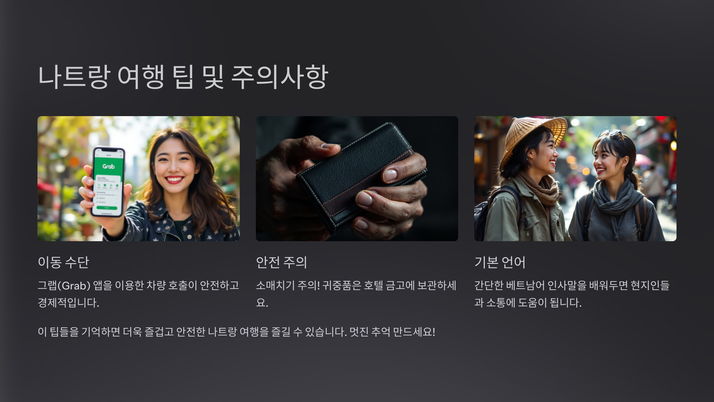 • 현지 언어: 영어가 잘 통하지 않는 곳도 있으니 기본적인 베트남어 인사말을 배워두면 유용합니다.