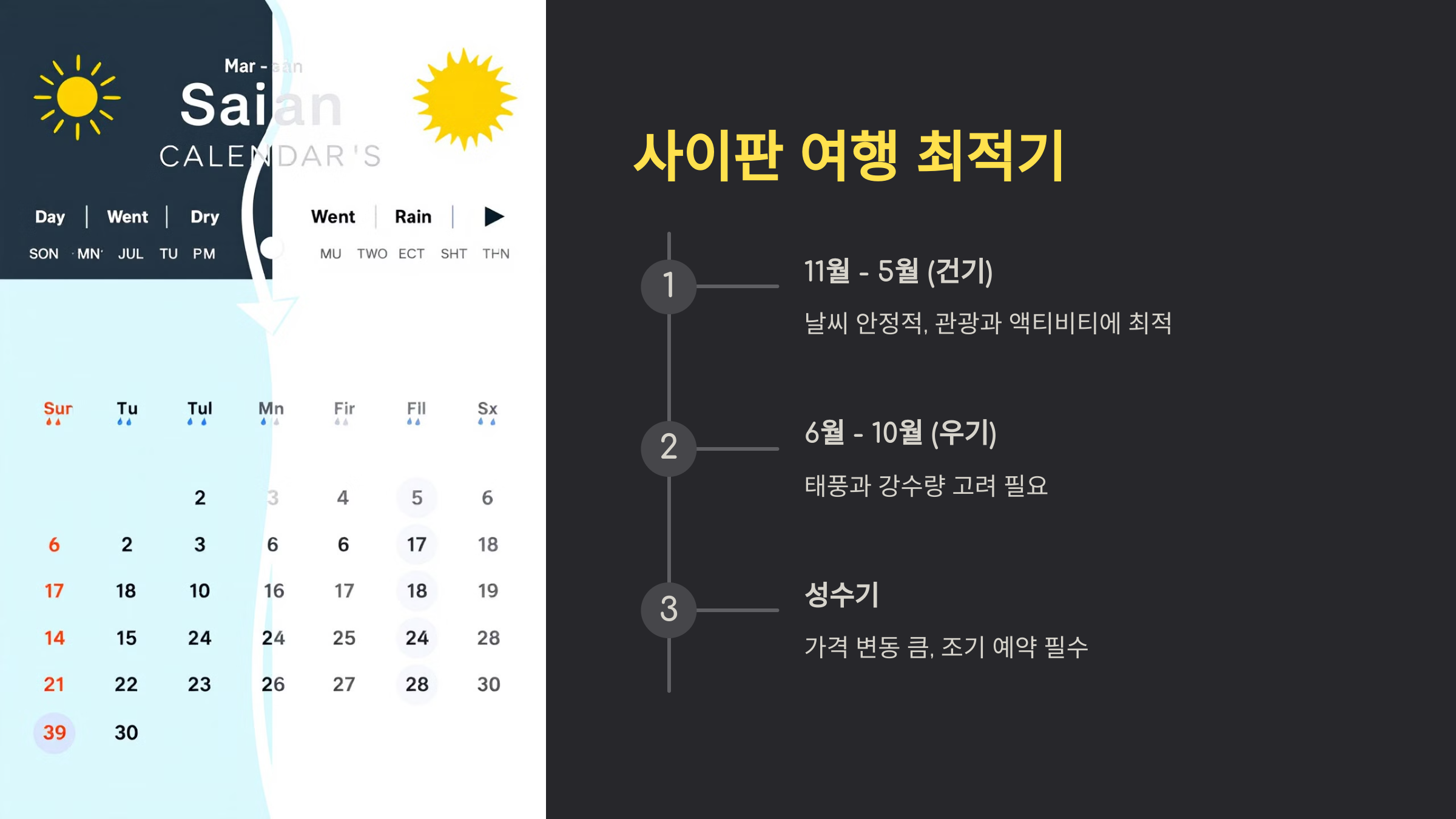 사이판은 열대성 기후를 가지고 있어 연중 기온이 27~30°C로 따뜻합니다. 그러나 우기가 있는 6월부터 10월까지는 강수량이 많아 습도가 높은 편입니다. 이 기간은 태풍이 발생할 가능성도 있으니 여행 계획 시 주의가 필요합니다. 건기인 11월부터 5월까지가 여행하기에 가장 좋은 시기로, 맑고 건조한 날씨를 만끽할 수 있습니다.