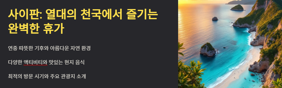 사이판을 제대로 즐기기 위해서는 사전에 체계적인 계획을 세우는 것이 중요합니다. 어떤 액티비티를 선택할지, 어떤 명소를 방문할지, 또 무엇을 먹을지에 따라 여행의 질이 달라질 수 있습니다. 여행 일정에 따라 다르게 설계된 옵션들을 활용하면 더욱 만족스러운 여행을 만들 수 있습니다. 지금부터 사이판 여행을 위한 모든 정보를 자세히 살펴보겠습니다.
