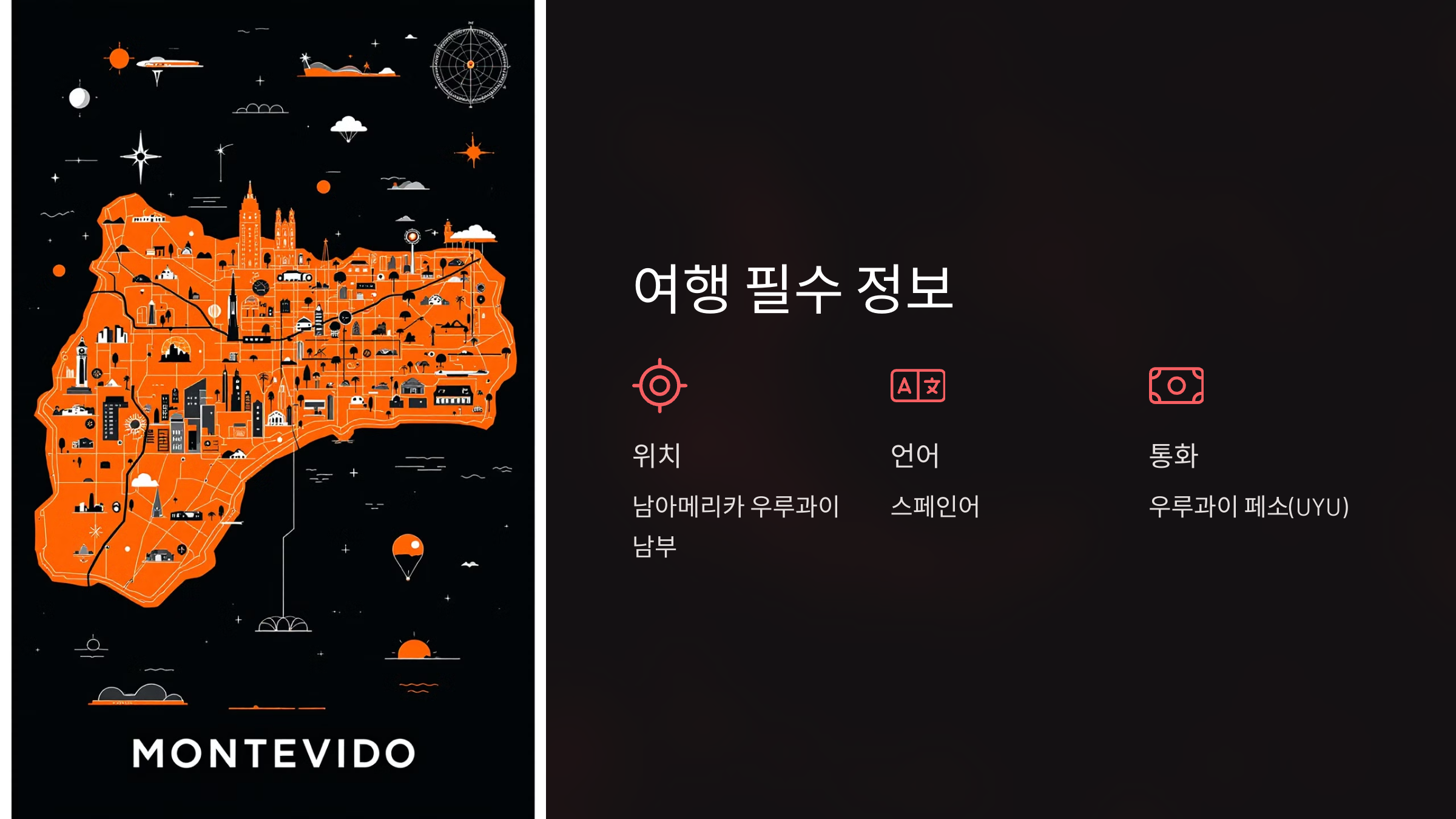 그럼 이제 몬테비데오의 매력을 하나씩 살펴보겠습니다. 몬테비데오를 여행하기 전에 알아야 할 필수 정보부터, 놓치지 말아야 할 명소, 먹거리, 숙소, 교통편 등 모든 정보를 정리해보았습니다.