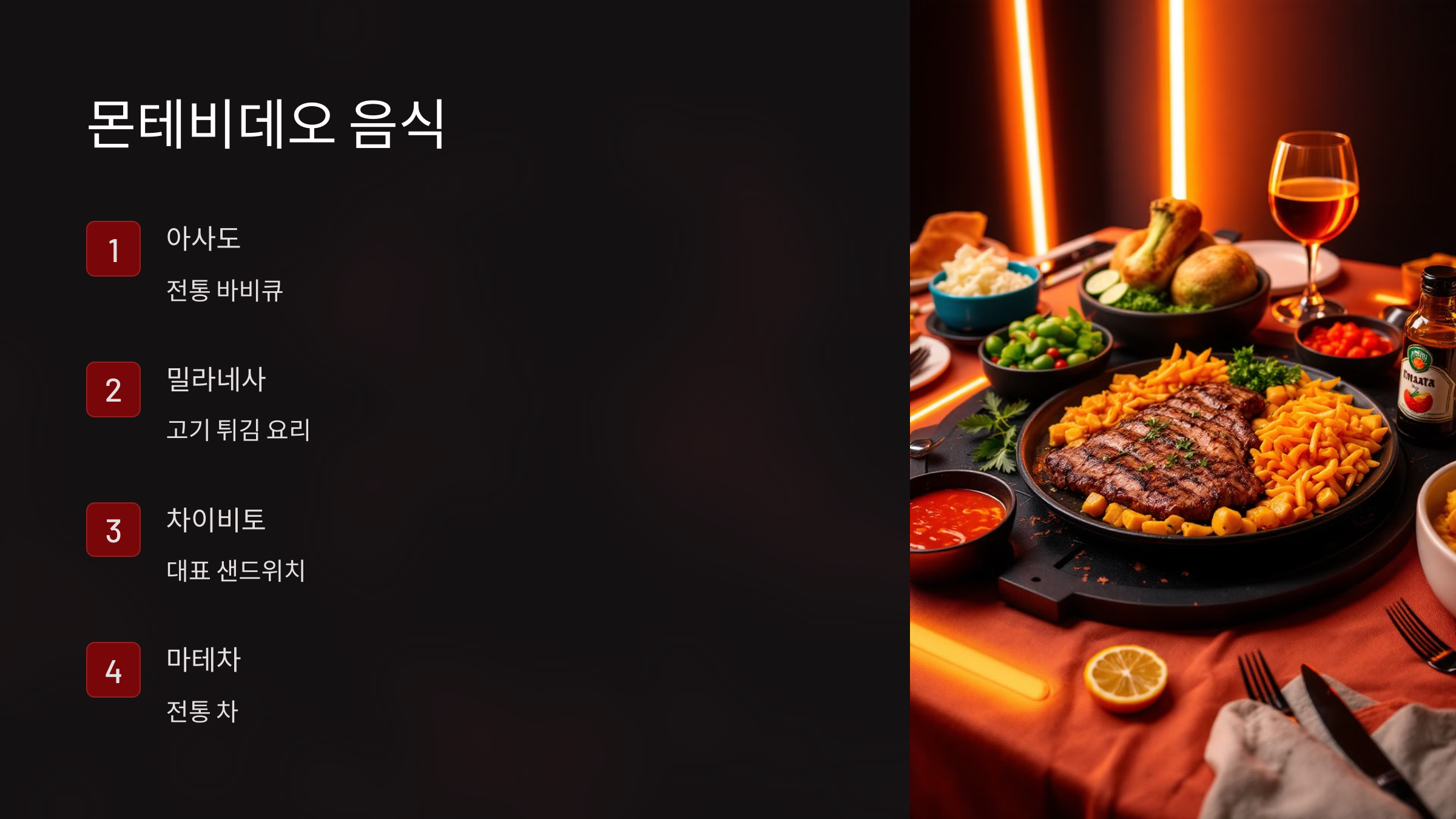 몬테비데오 여행에서 빠질 수 없는 것이 바로 미식 탐방입니다. 우루과이는 소고기 생산이 발달한 나라로, 육질이 뛰어난 스테이크 요리가 특히 유명합니다.