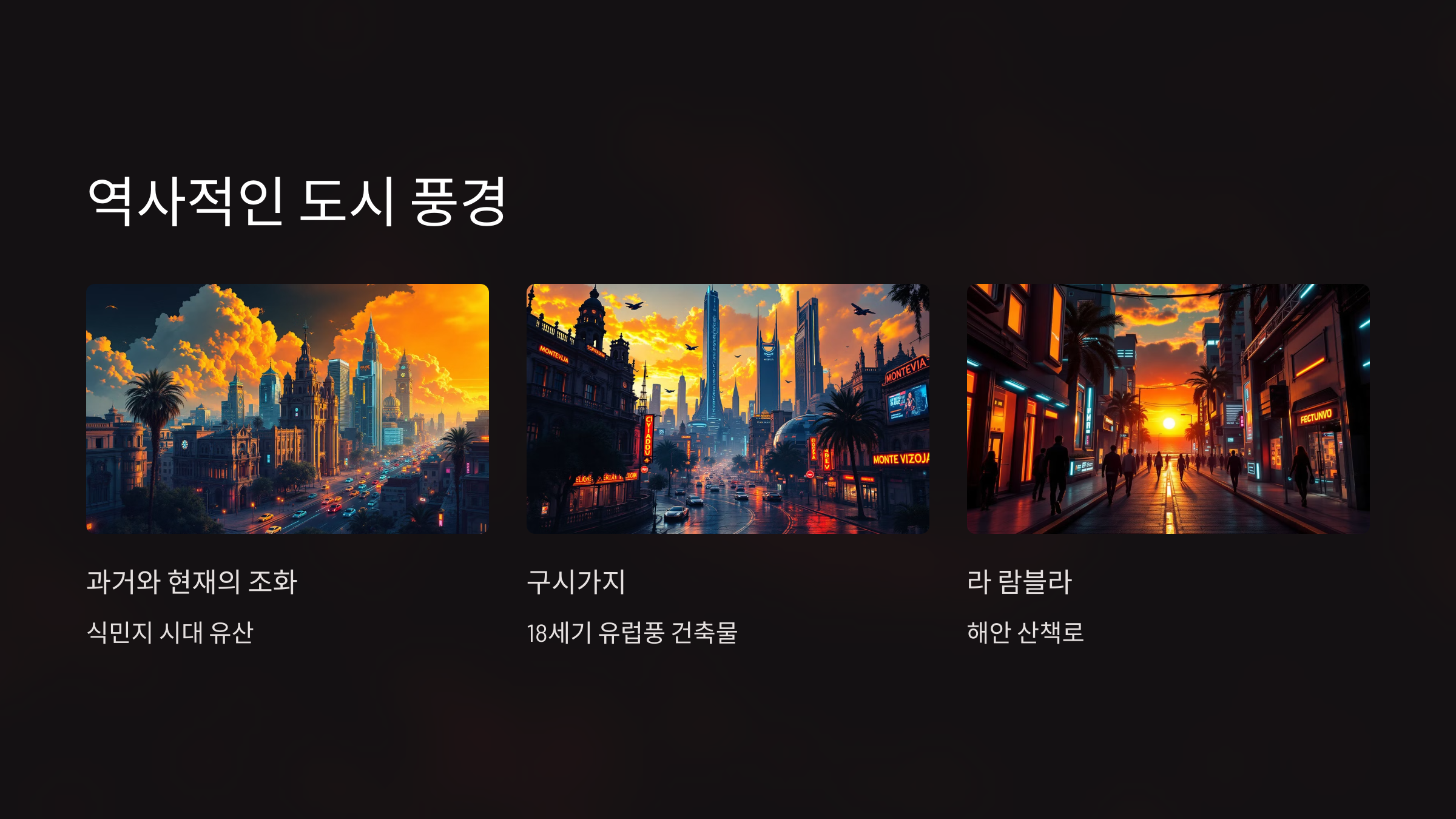 이 도시는 과거 식민지 시대부터 이어진 역사적인 유산과 현대적인 감각이 조화를 이루고 있어, 걷는 것만으로도 흥미로운 풍경을 감상할 수 있습니다. 특히, 구시가지(시우다드 비에하)에는 18세기부터 내려온 유럽풍 건축물이 그대로 남아 있어 마치 과거로 여행을 떠난 듯한 기분을 느낄 수 있습니다. 또한, 몬테비데오는 ‘세계에서 가장 긴 해안 산책로(라람블라)’를 자랑하며, 이곳에서 바라보는 일몰은 환상적입니다.