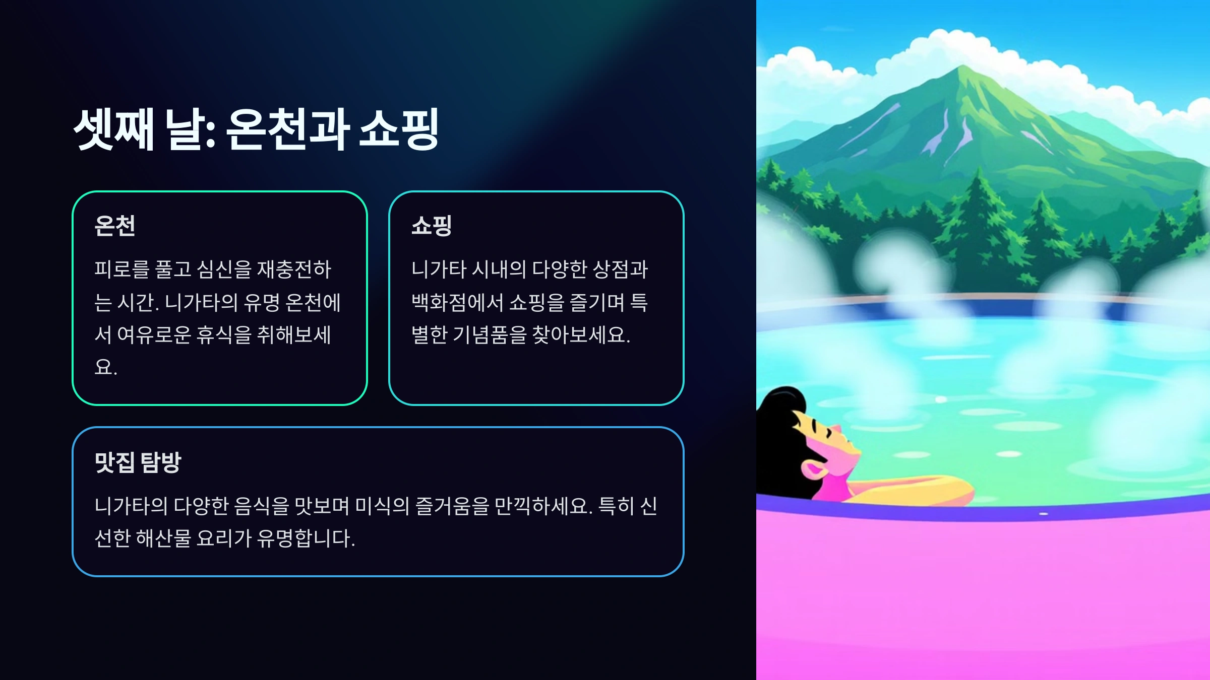 니가타는 일본 혼슈의 북서부에 위치한 아름다운 지역이에요. 초보 여행자들에게도 매력적인 목적지로, 도시와 자연이 조화를 이루고 있답니다. 2박 3일 동안 니가타의 하이라이트를 모두 즐길 수 있도록 짜인 일정이니 참고해보세요!