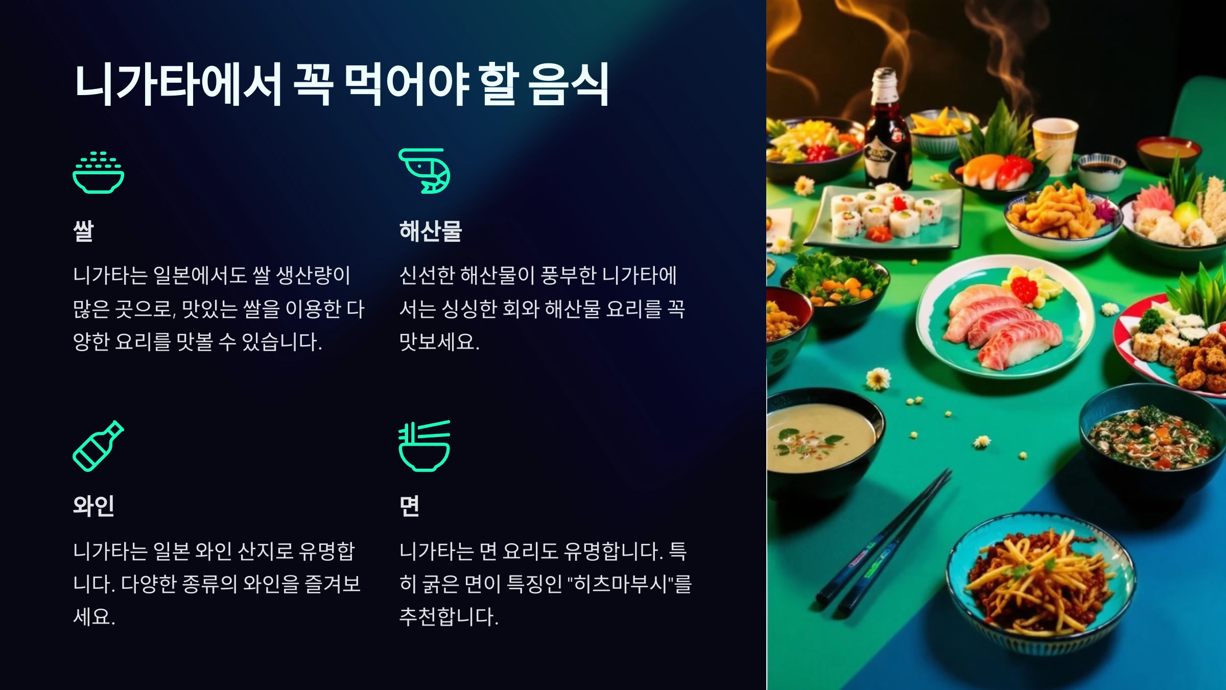 니가타는 일본 내에서도 미식의 도시로 유명해요. 꼭 맛봐야 할 음식으로는 니가타산 쌀로 만든 카이센동, 청주, 그리고 소박하면서도 깊은 맛을 가진 헤기 소바가 있어요.