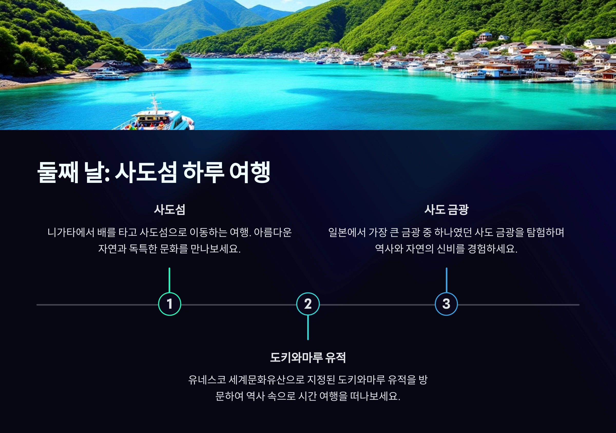 둘째 날에는 니가타에서 배를 타고 사도섬으로 이동해보세요. 사도섬은 아름다운 자연경관과 독특한 문화로 유명해요. 아침 일찍 니가타항에서 출발하는 제트포일 고속선을 타면 1시간 안에 도착할 수 있어요.