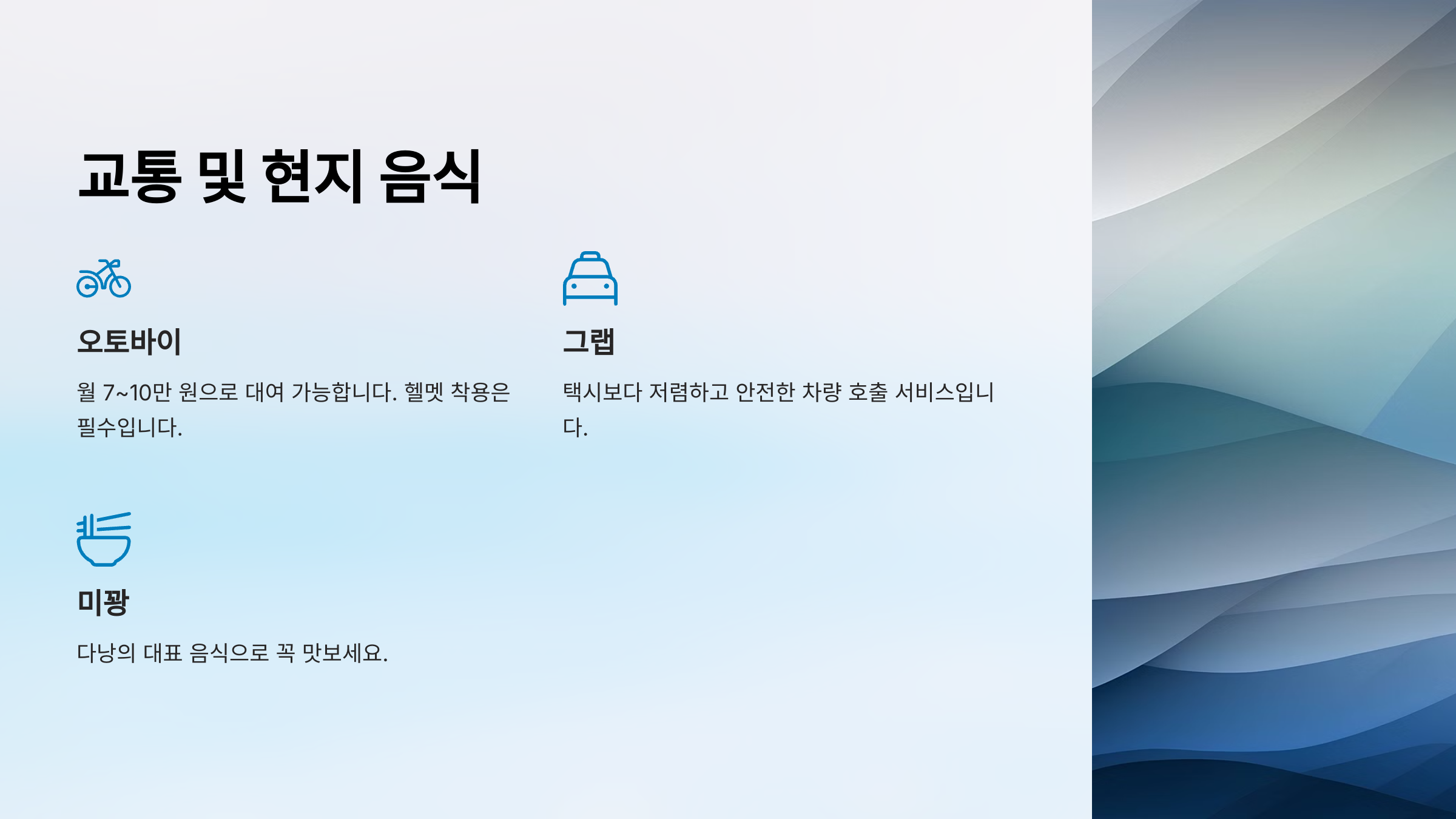 다낭에서는 오토바이, 택시, 그리고 Grab(그랩) 같은 차량 호출 서비스를 주로 이용합니다.