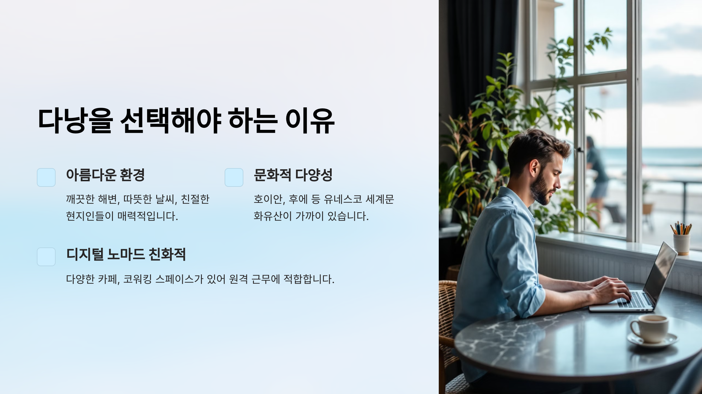 다낭은 아름다운 해변, 따뜻한 날씨, 그리고 친절한 현지인들로 유명합니다. 이러한 매력은 관광객뿐만 아니라 장기 체류자들에게도 매력적입니다.