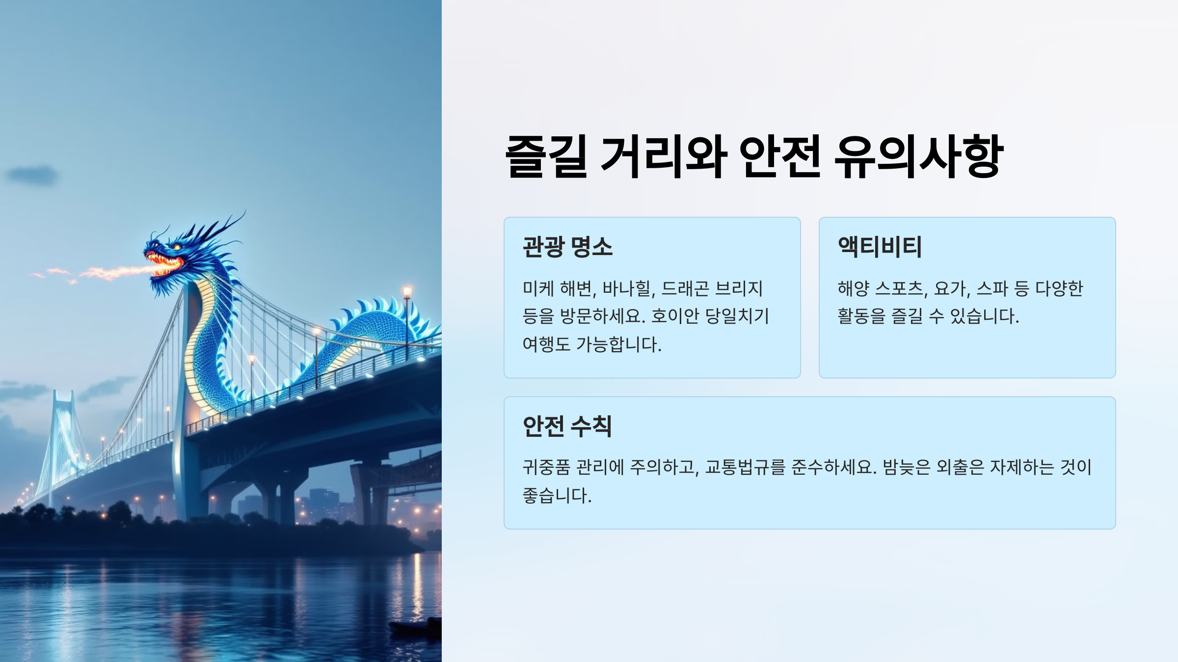 다낭은 비교적 안전한 도시로 알려져 있지만, 기본적인 안전 수칙은 지켜야 합니다.