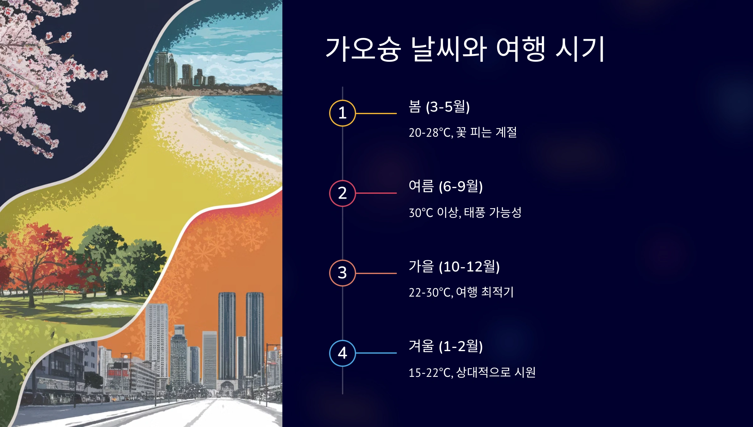 가오슝은 연중 기온이 높고 비교적 따뜻한 날씨를 유지합니다. 하지만 여행하기 가장 좋은 시기는 가을과 봄이 기온이 적당하고 습도가 낮아 쾌적한 여행이 가능합니다.