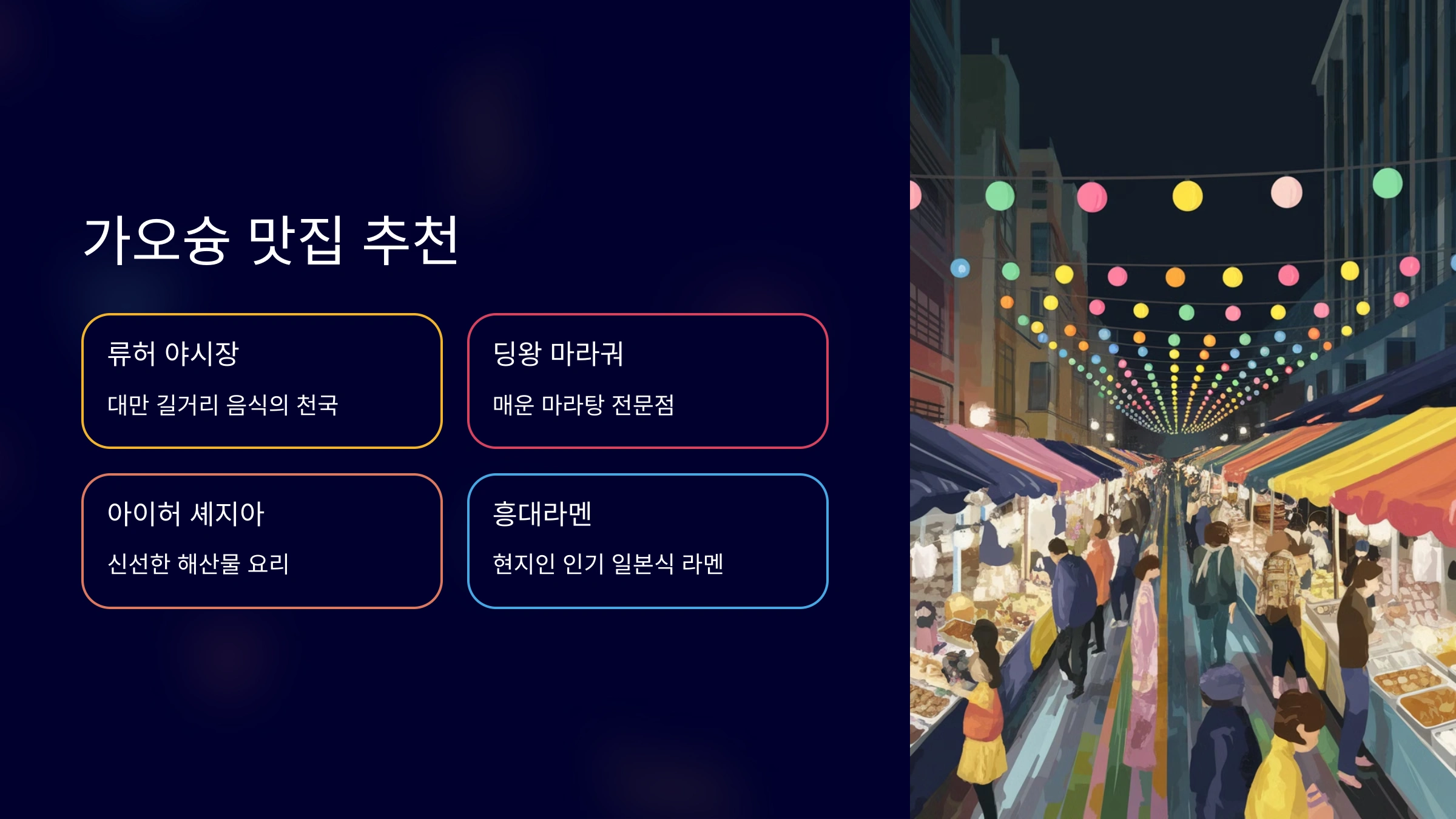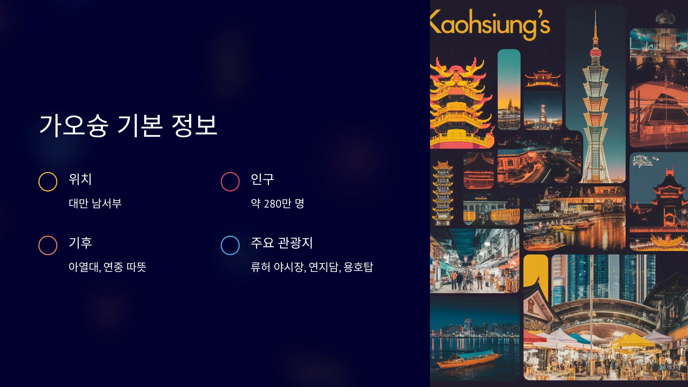 가오슝은 대만 남부의 최대 도시이자, 국제적인 무역항으로도 유명합니다. 연중 따뜻한 기후 덕분에 언제 방문해도 여행하기 좋은 곳이며, 야시장 문화가 발달해 맛있는 길거리 음식을 쉽게 즐길 수 있습니다.