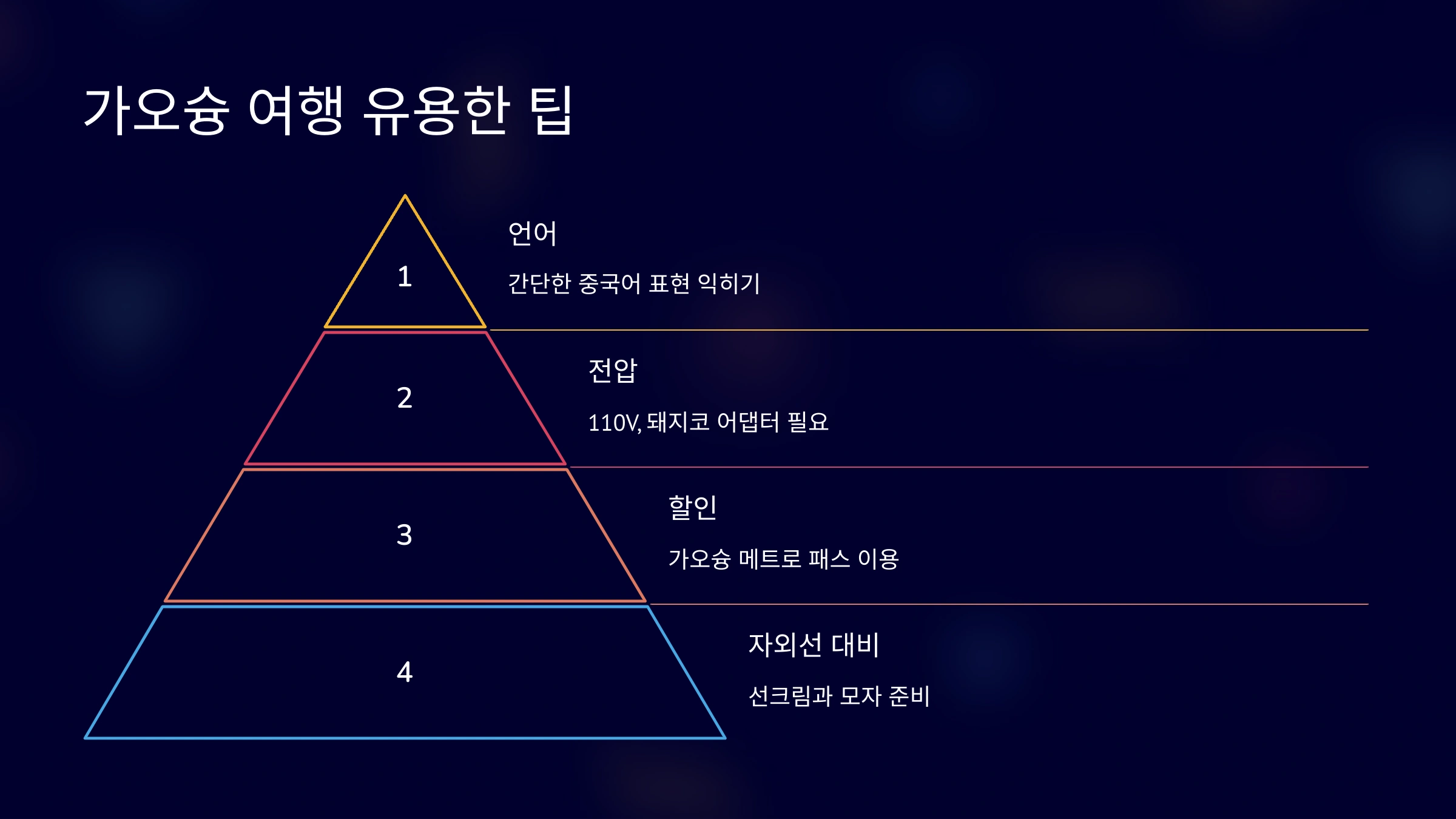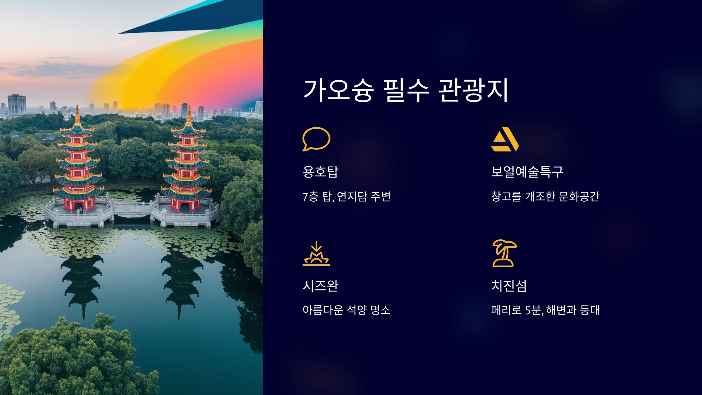 이번 글에서는 가오슝 여행을 계획하는 분들을 위해 꼭 방문해야 할 명소, 유명 맛집, 교통 정보, 그리고 가오슝에서 즐길 수 있는 특별한 체험까지 모두 정리해보았습니다. 가오슝 여행을 제대로 즐기기 위해 알아야 할 필수 정보와 숨겨진 명소까지 소개하니, 가오슝을 방문할 예정이라면 이 글을 꼭 끝까지 읽어보세요!