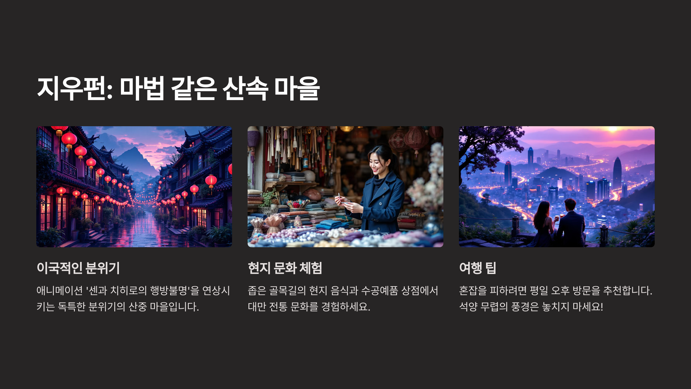 지우펀은 애니메이션 센과 치히로의 행방불명의 배경으로 널리 알려지면서 세계 각지에서 많은 관광객들이 찾는 장소입니다.