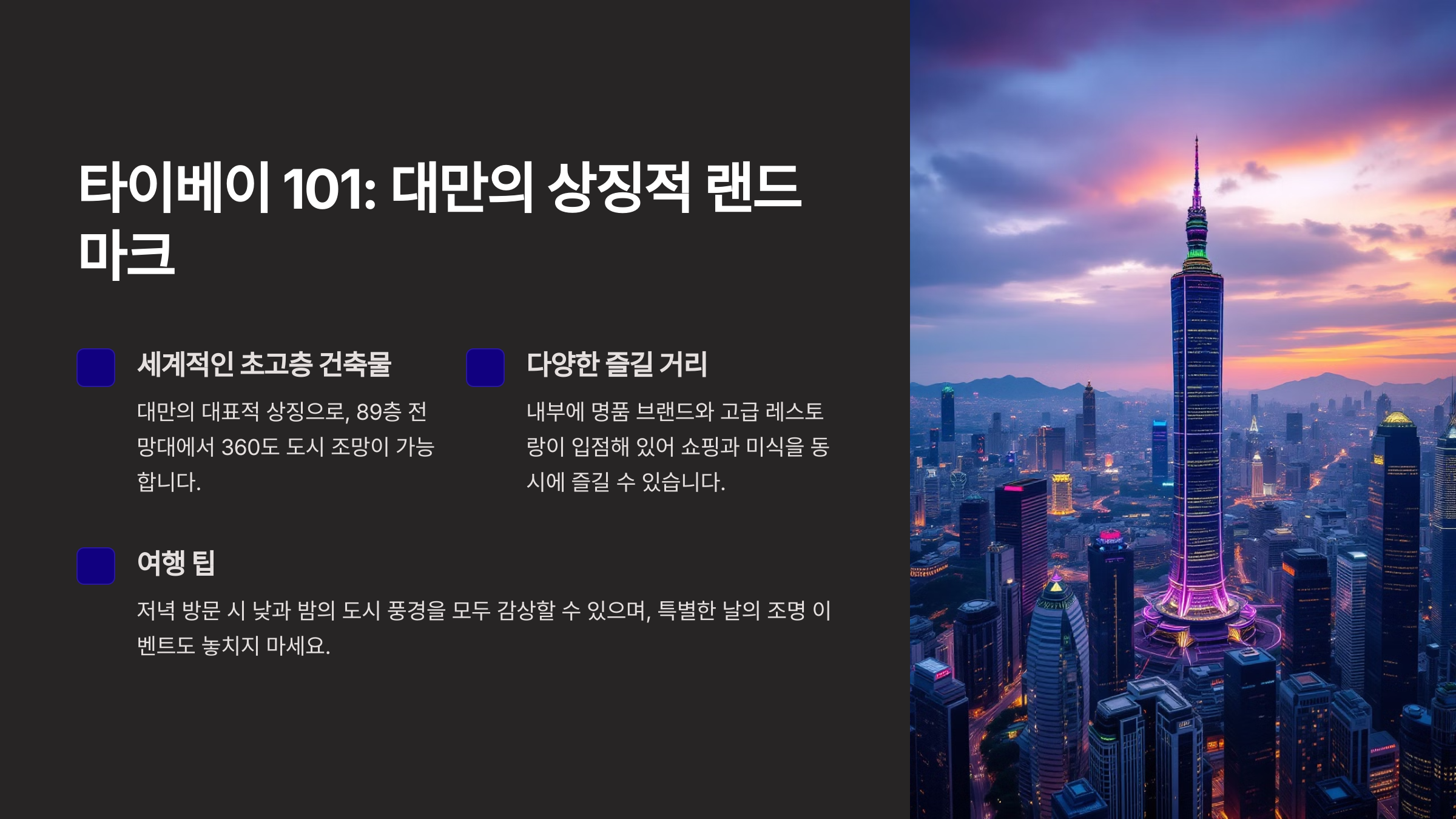 타이베이 101은 대만을 대표하는 초고층 건물로, 세계적인 랜드마크로 자리 잡은 곳입니다.
