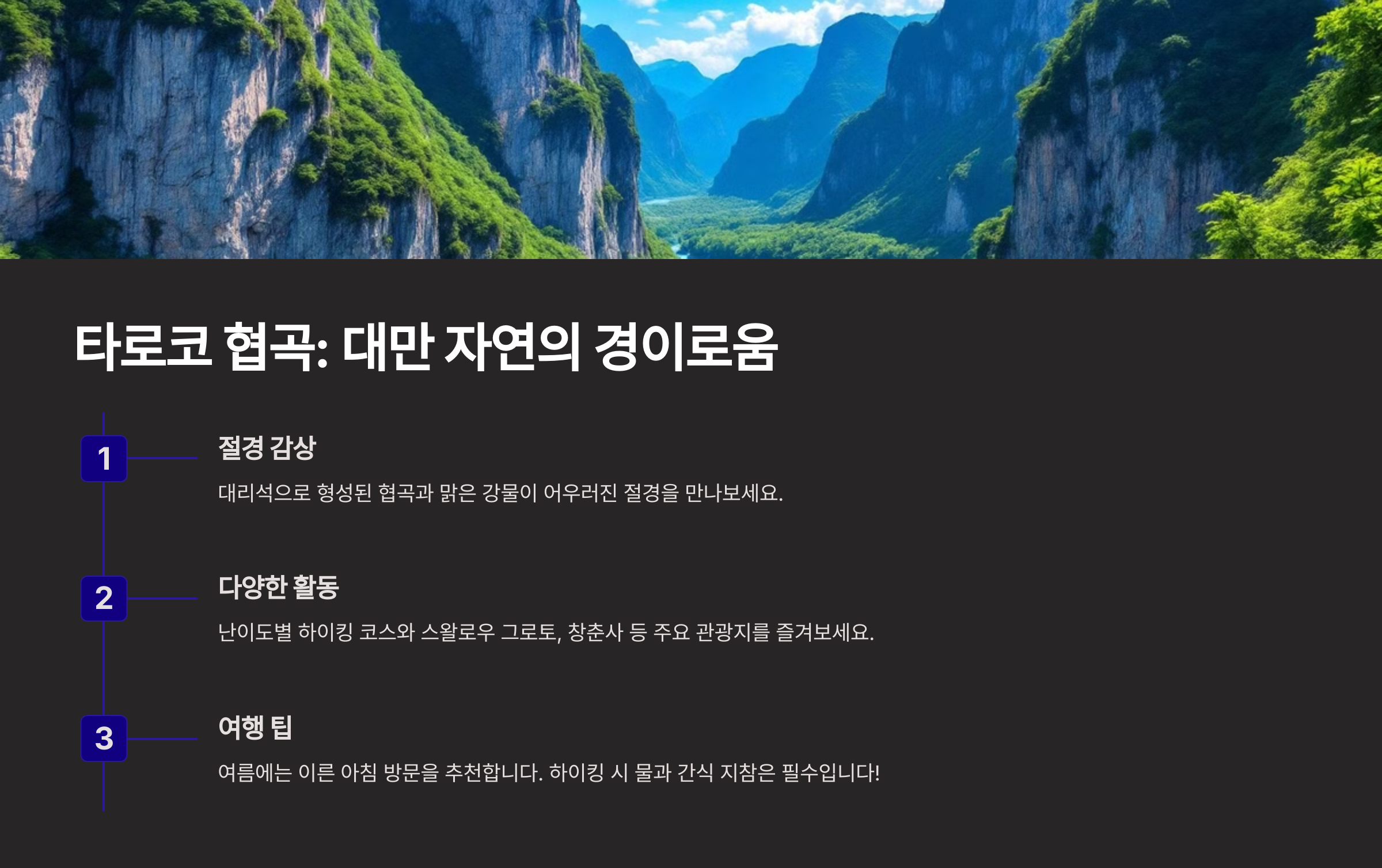 대만은 아름다운 자연 경관으로도 유명하며, 그중에서도 타로코 협곡은 압도적인 스케일과 멋진 풍경으로 많은 이들의 사랑을 받는 곳입니다.