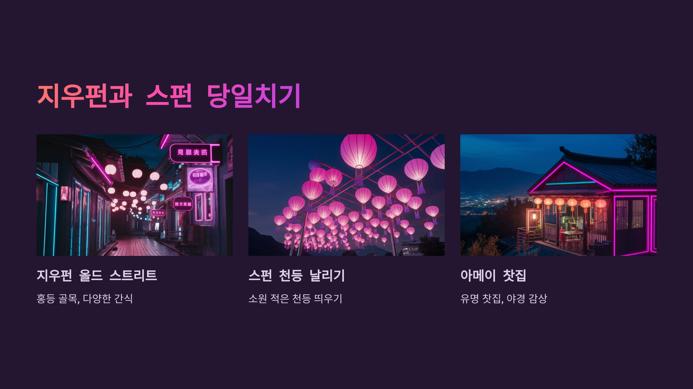 대만은 다양한 볼거리와 먹거리로 가득한 여행지예요. 타이베이의 화려한 도심부터 감성 가득한 지우펀, 그리고 타이중의 자연까지 짧은 일정에도 꽉 찬 여행을 즐길 수 있답니다.