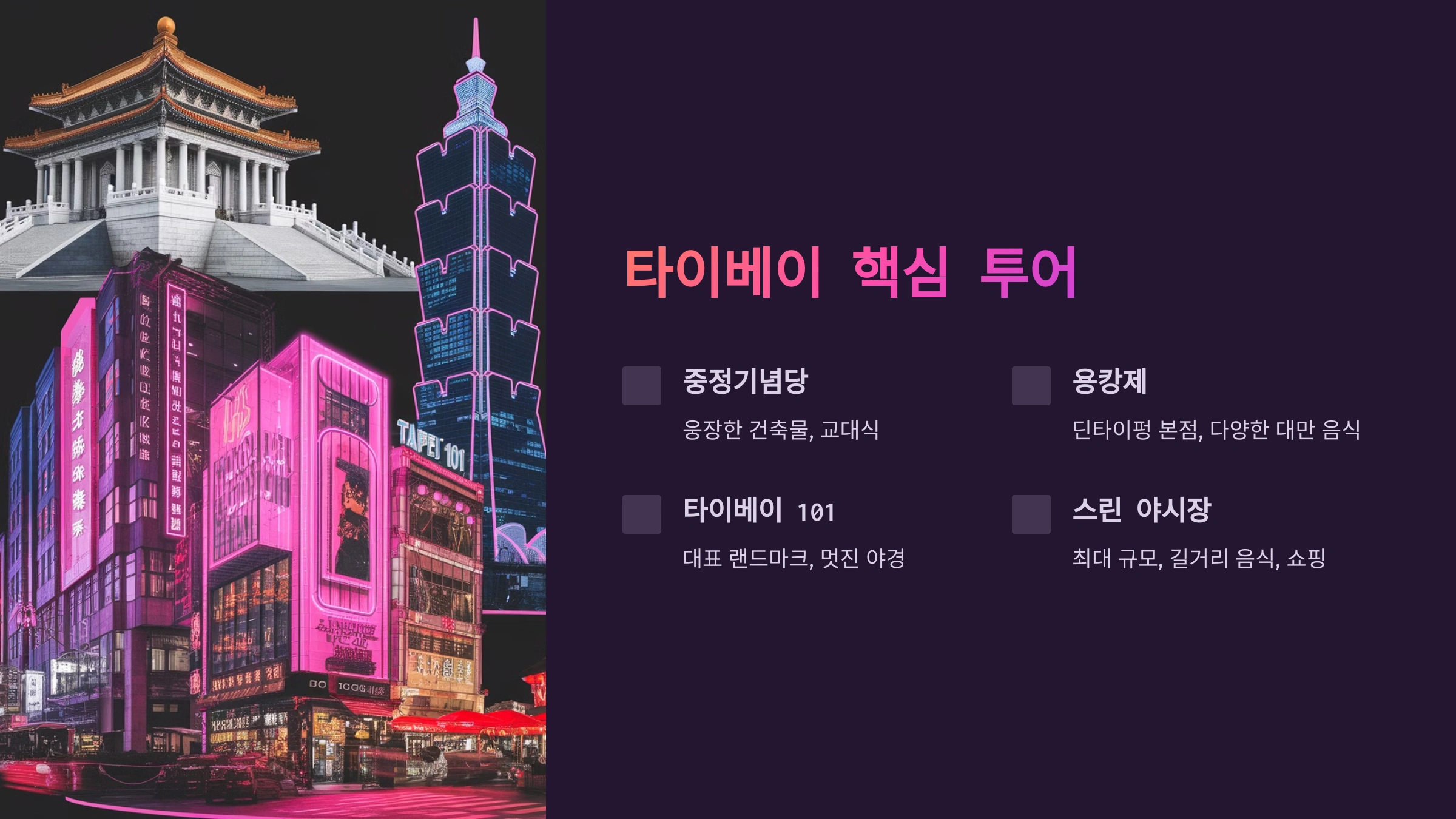 야시장 탐방과 함께 대만의 대표 음식을 맛보고, 명소를 돌며 특별한 추억을 만들어 보세요. 지금부터 3박 4일 동안 알차게 여행할 수 있는 일정을 소개할게요!