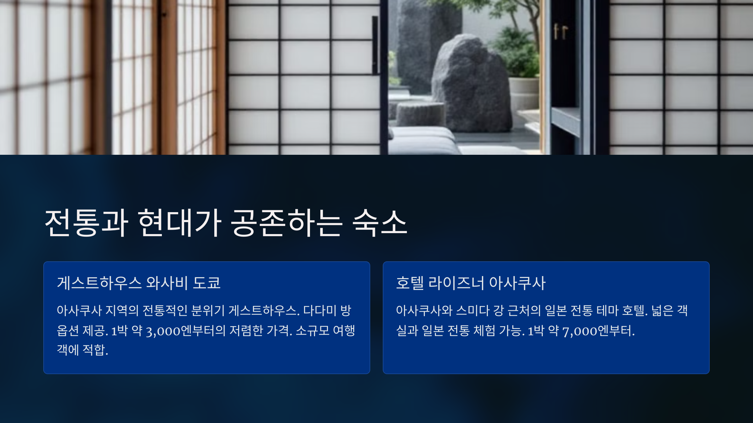 • 특징: 아사쿠사 지역에 위치한 전통적인 분위기의 게스트하우스. 일본식 다다미 방 옵션도 있습니다.