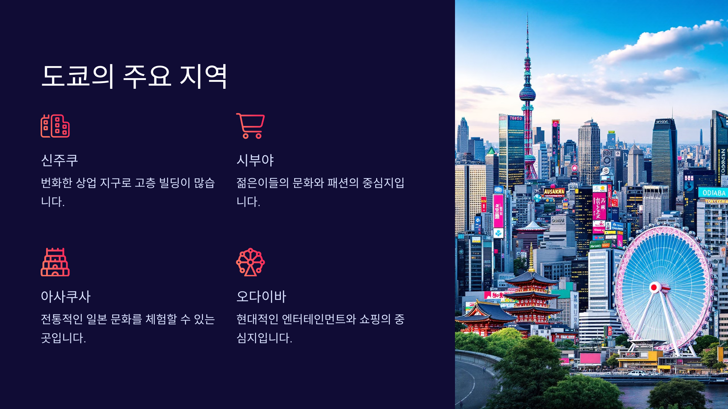 주요 지역으로는 신주쿠, 시부야, 아사쿠사, 오다이바, 하라주쿠 등이 있으며, 각 지역은 고유한 매력을 가지고 있습니다.