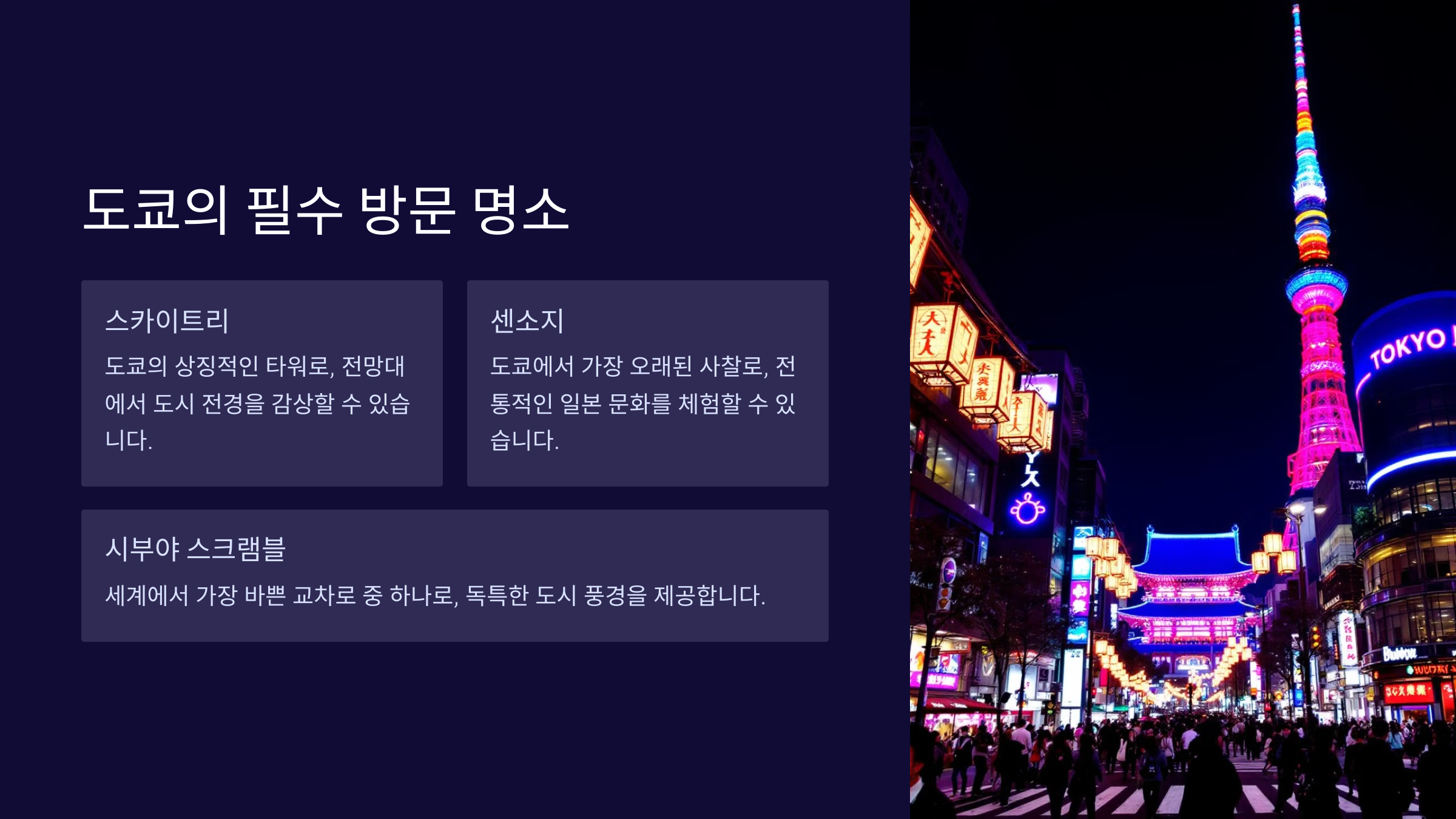 도쿄는 일본의 수도이자 세계에서 가장 번화한 도시 중 하나로, 전통적인 사찰과 현대적인 건축물이 조화를 이루고 있습니다.