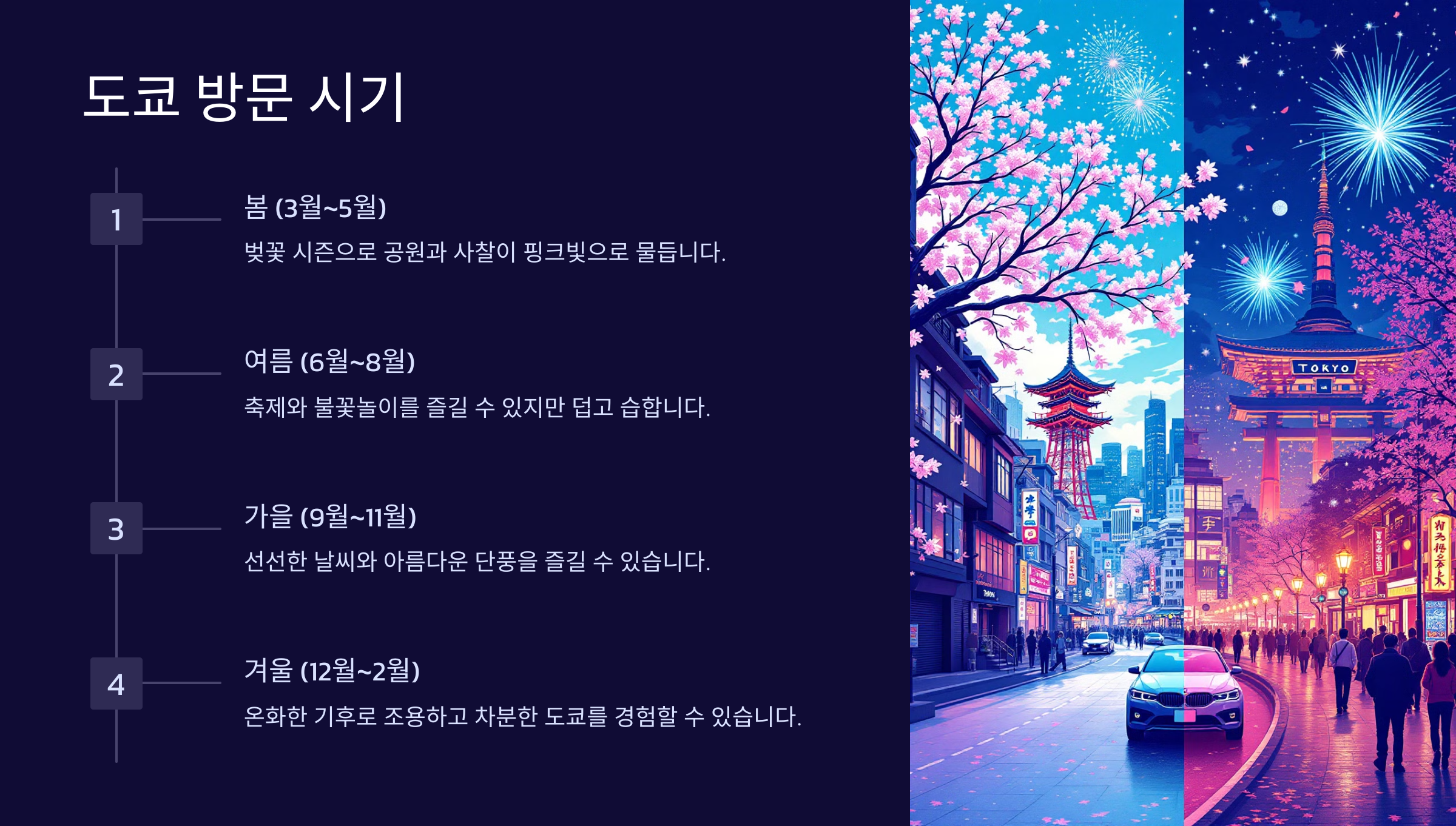 도쿄는 사계절이 뚜렷하며, 각 계절마다 독특한 분위기를 제공합니다. 이를 활용해 계획을 세우는 것이 중요합니다.