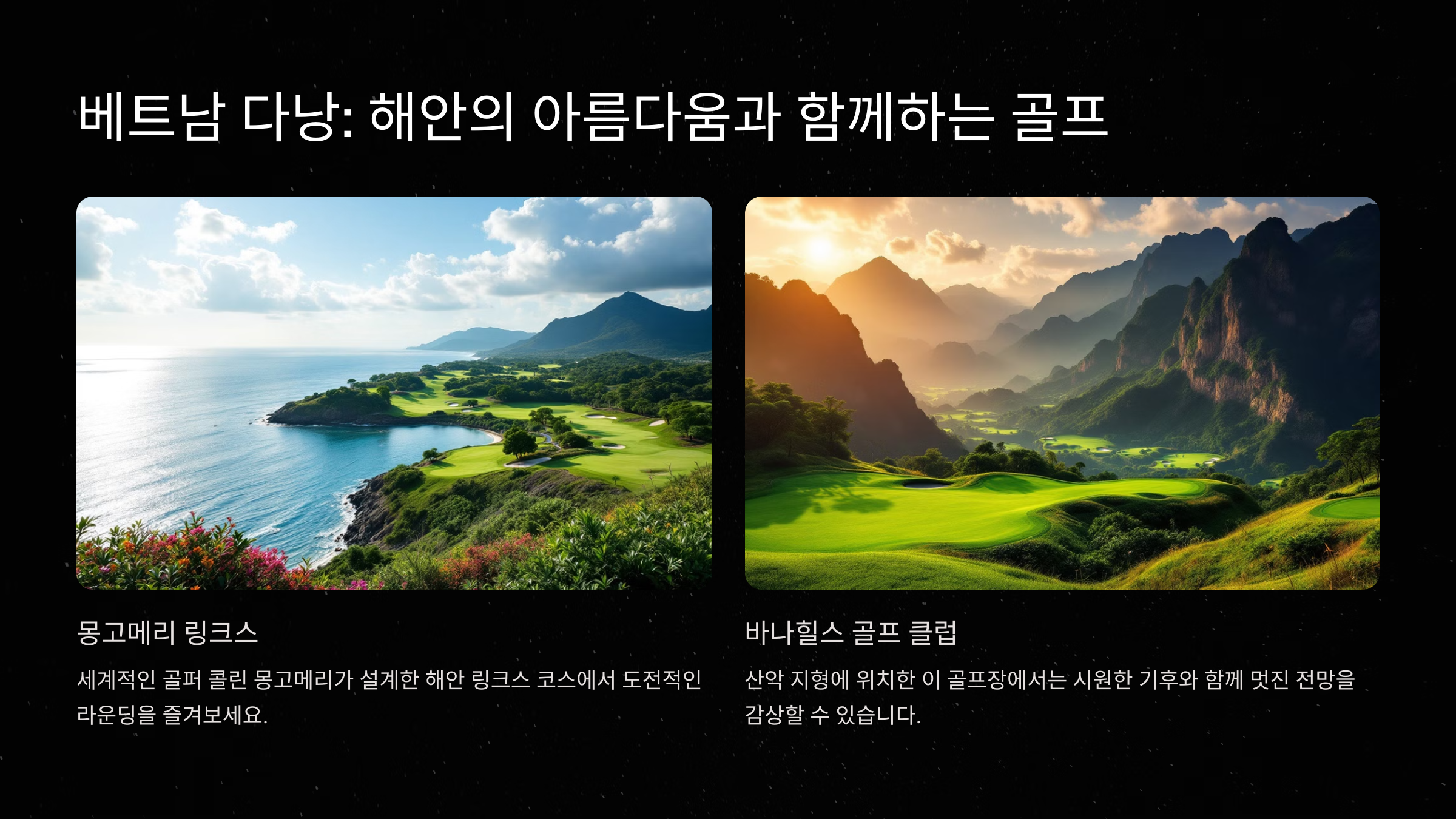 다낭은 최근 골프 여행지로 급부상한 지역으로, 세계적 수준의 골프 코스와 아름다운 자연이 결합된 곳입니다. 해안선을 따라 위치한 골프 코스는 뛰어난 경치를 자랑하며, 현대적인 시설과 서비스를 제공합니다.