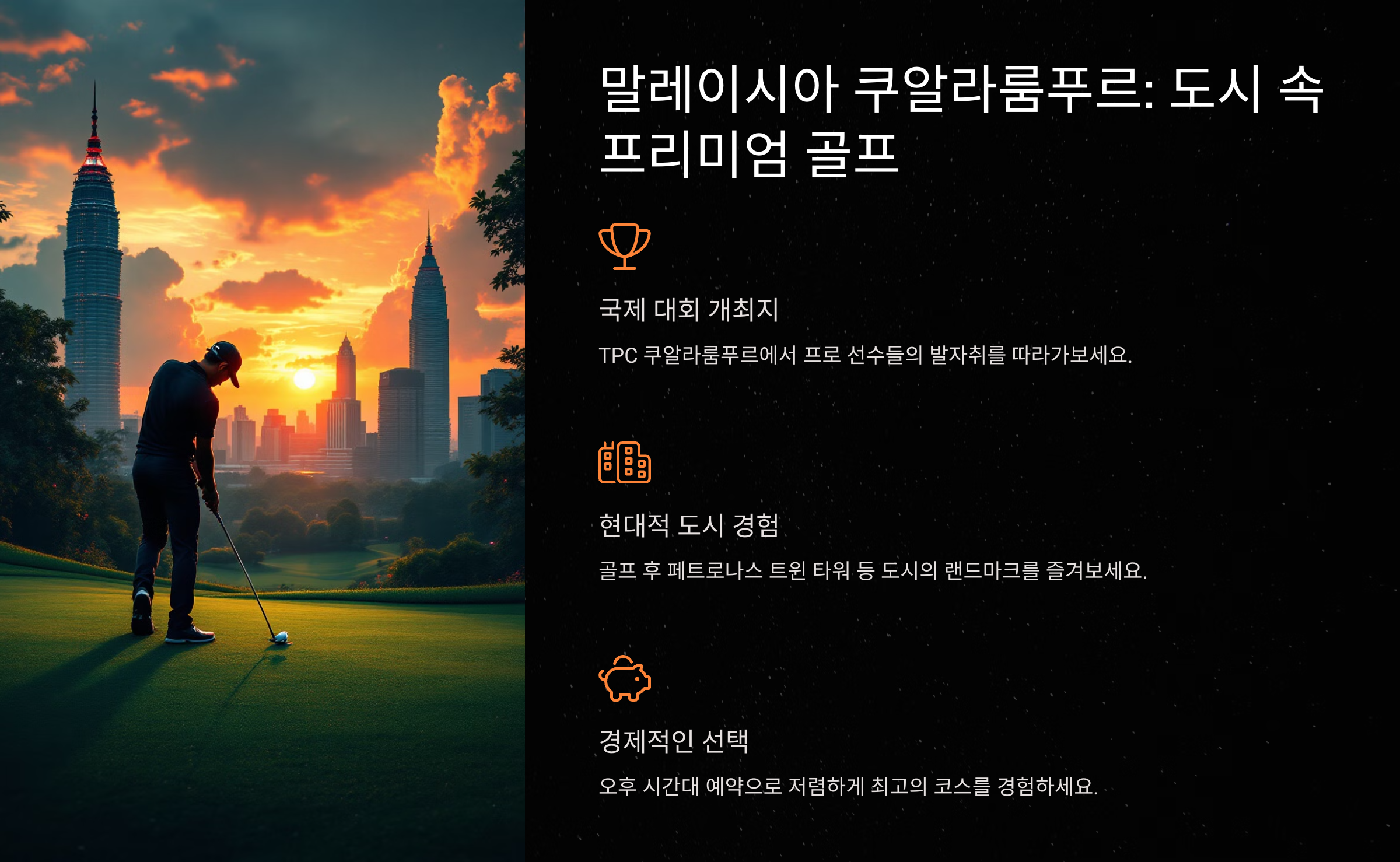 쿠알라룸푸르는 동남아시아에서 가장 편리하고 현대적인 골프 여행지 중 하나입니다. 다양한 골프 코스와 완벽한 시설, 뛰어난 접근성이 특징입니다.
