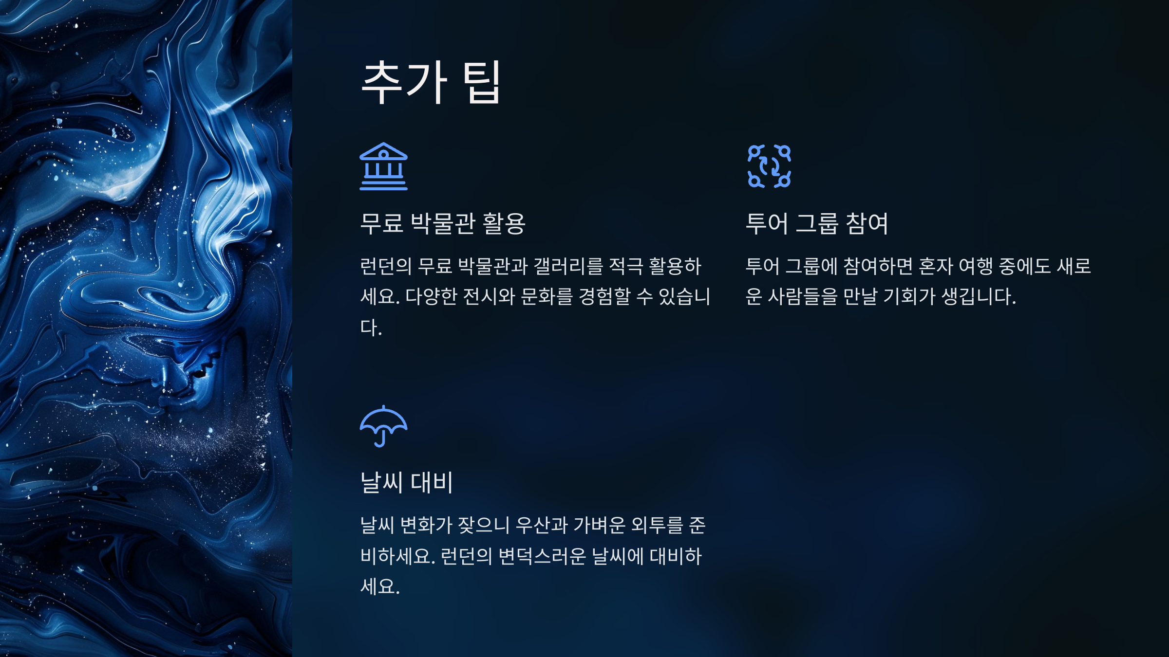 • 오이스터 카드 또는 컨택트리스 카드 사용: 런던의 대중교통을 경제적으로 이용할 수 있습니다. 지하철과 버스는 안전하고 효율적입니다.