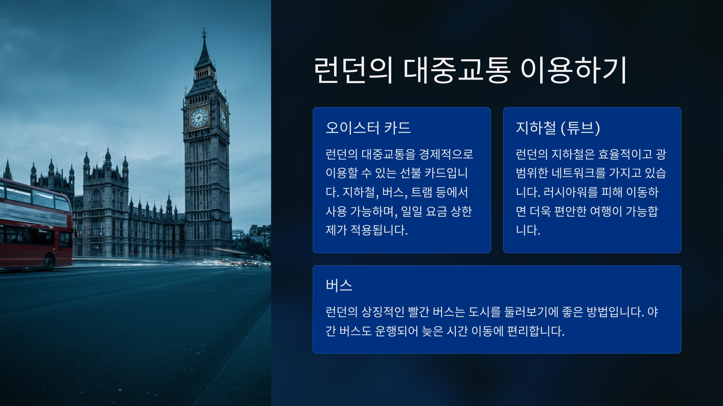 런던의 대중교통은 체계적이고 효율적입니다. 오이스터 카드를 사용하면 더 편리하게 이동할 수 있습니다.