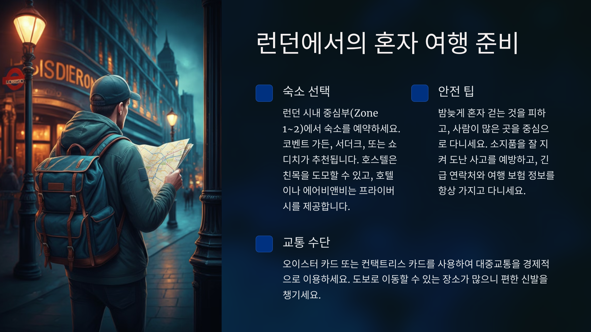 • 중심지 선택: 런던 시내 중심부(Zone 1~2)에서 숙소를 예약하세요. 추천 지역은 코벤트 가든, 서더크, 또는 쇼디치입니다. 이 지역은 대중교통과 관광지 접근성이 뛰어나며 안전한 편입니다.