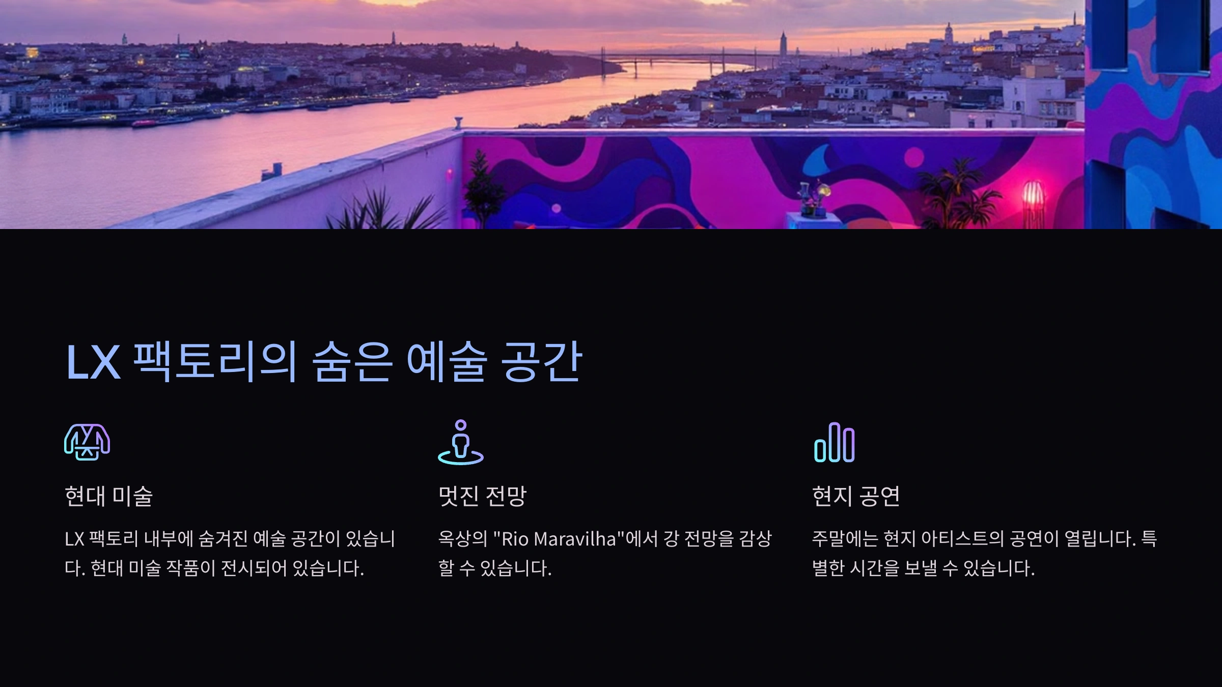 LX 팩토리는 리스본의 창의적인 예술과 문화의 중심지로 알려져 있지만, 그 내부에는 숨겨진 예술 공간이 있습니다. 특히, 옥상에 위치한 "Rio Maravilha"는 멋진 강 전망을 감상하며 예술적인 분위기를 즐길 수 있는 곳입니다. 내부에는 현대 미술 작품이 전시되어 있으며, 주말에는 현지 아티스트의 공연이 열리기도 합니다. 이곳에서 감각적인 분위기를 즐기며 특별한 시간을 보내보세요.