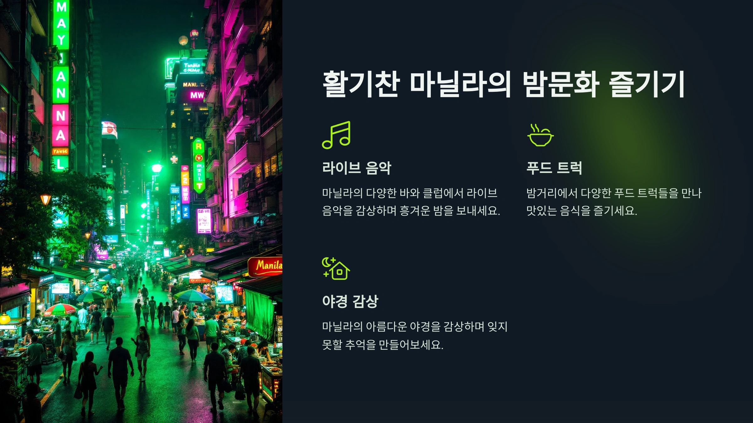 마닐라의 밤은 낮과는 또 다른 매력을 보여줘요. 마카티와 보니파시오 글로벌 시티(BGC)는 마닐라에서 가장 핫한 나이트라이프 지역으로, 트렌디한 바와 클럽이 가득해요. 이곳에서는 다양한 음악과 함께 춤을 즐기거나 칵테일 한 잔을 마시며 여유로운 시간을 보낼 수 있답니다.